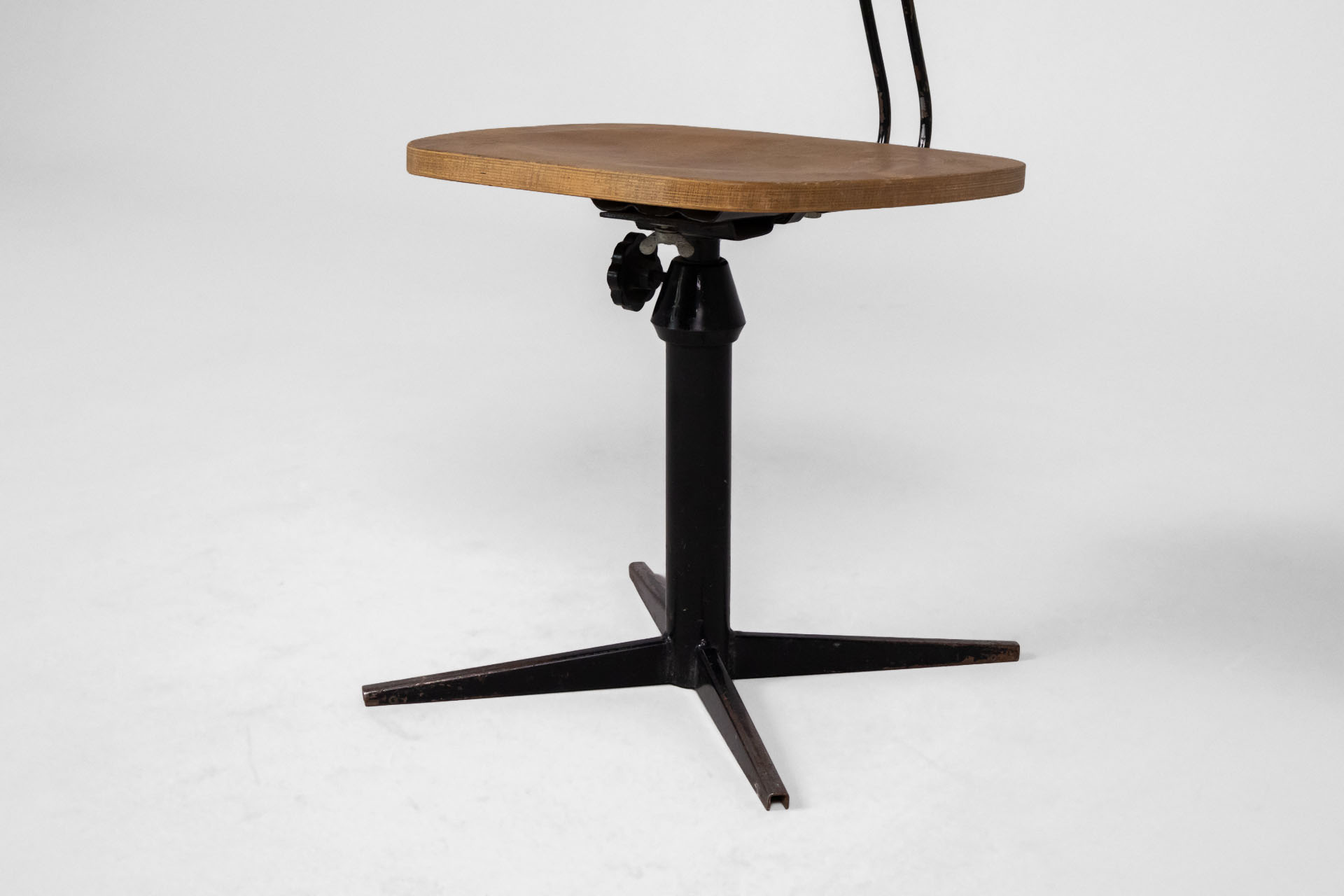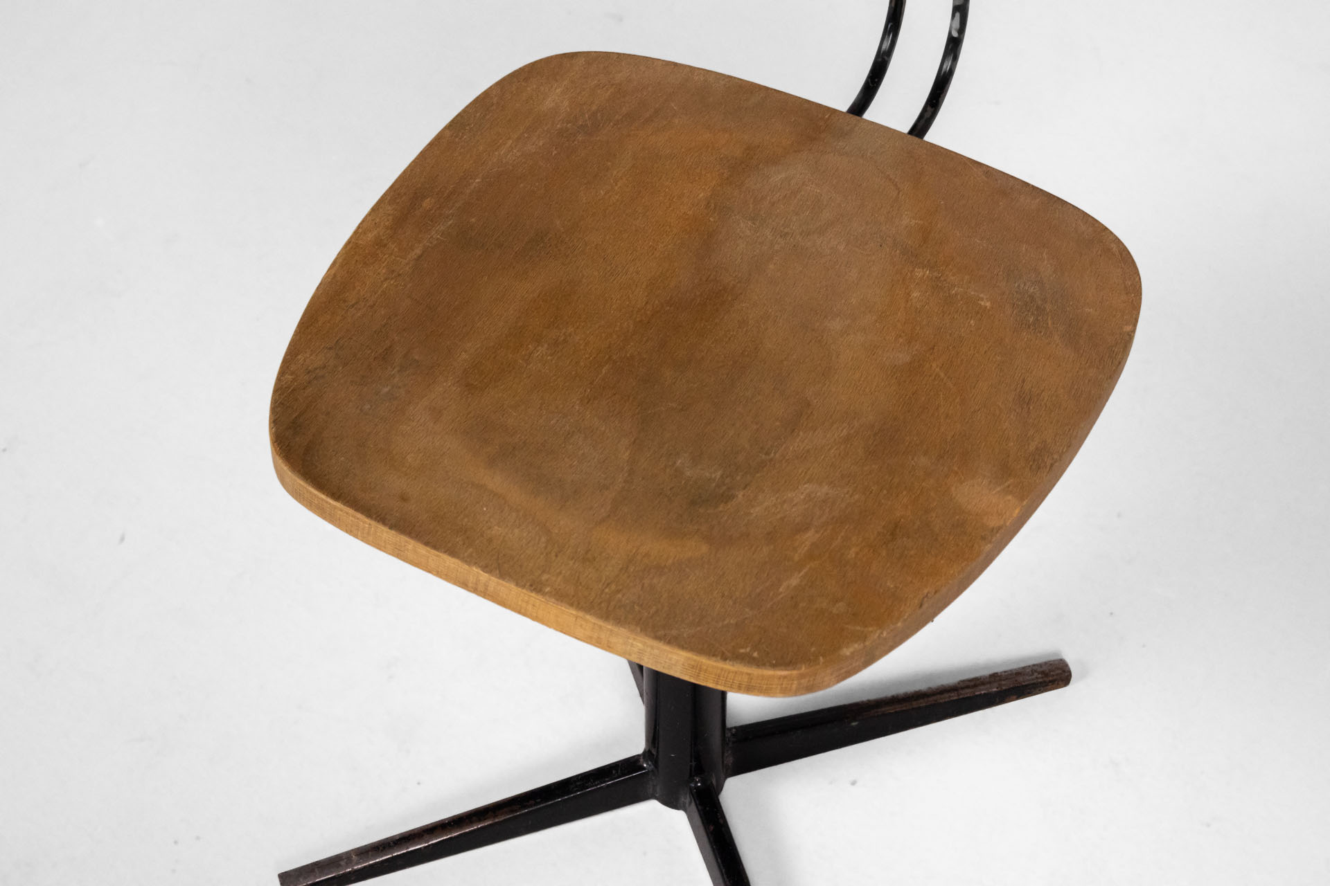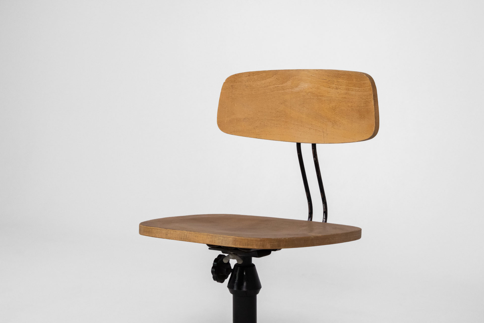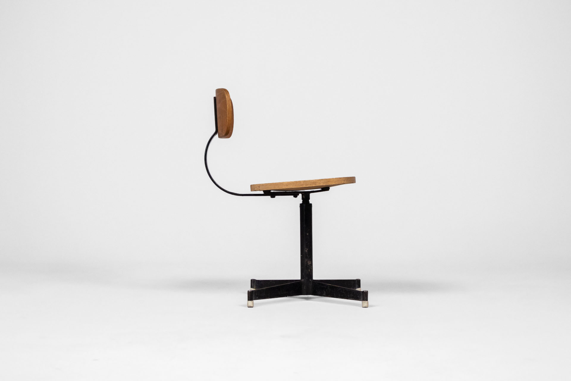 Modern, funkcionális forgószék, amely fém vázzal és ergonomikus, ívelt formájú fa ülőfelülettel rendelkezik. A szék színe meleg, természetes fa árnyalat, amely kellemes kontrasztot alkot a fekete fém lábakkal....