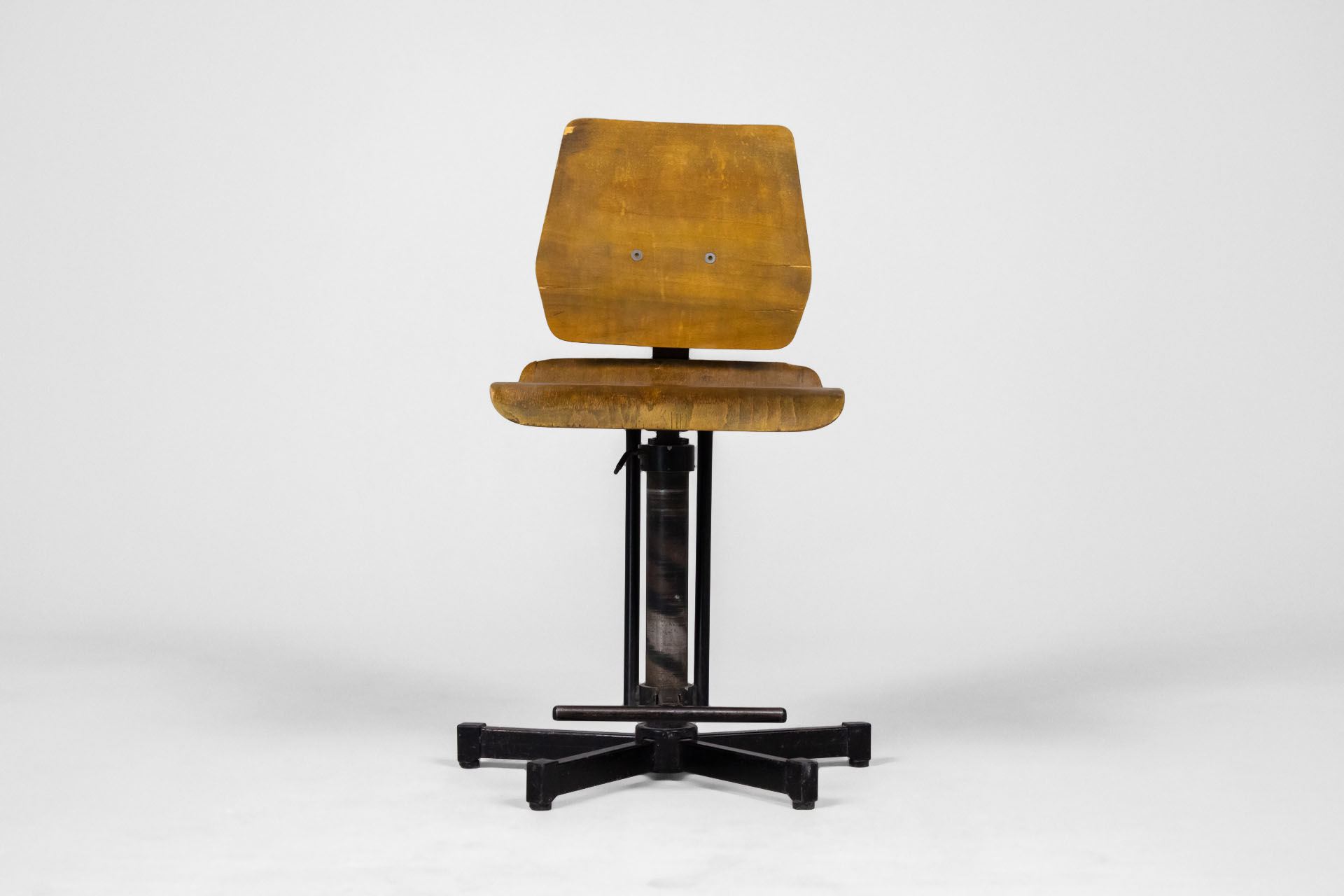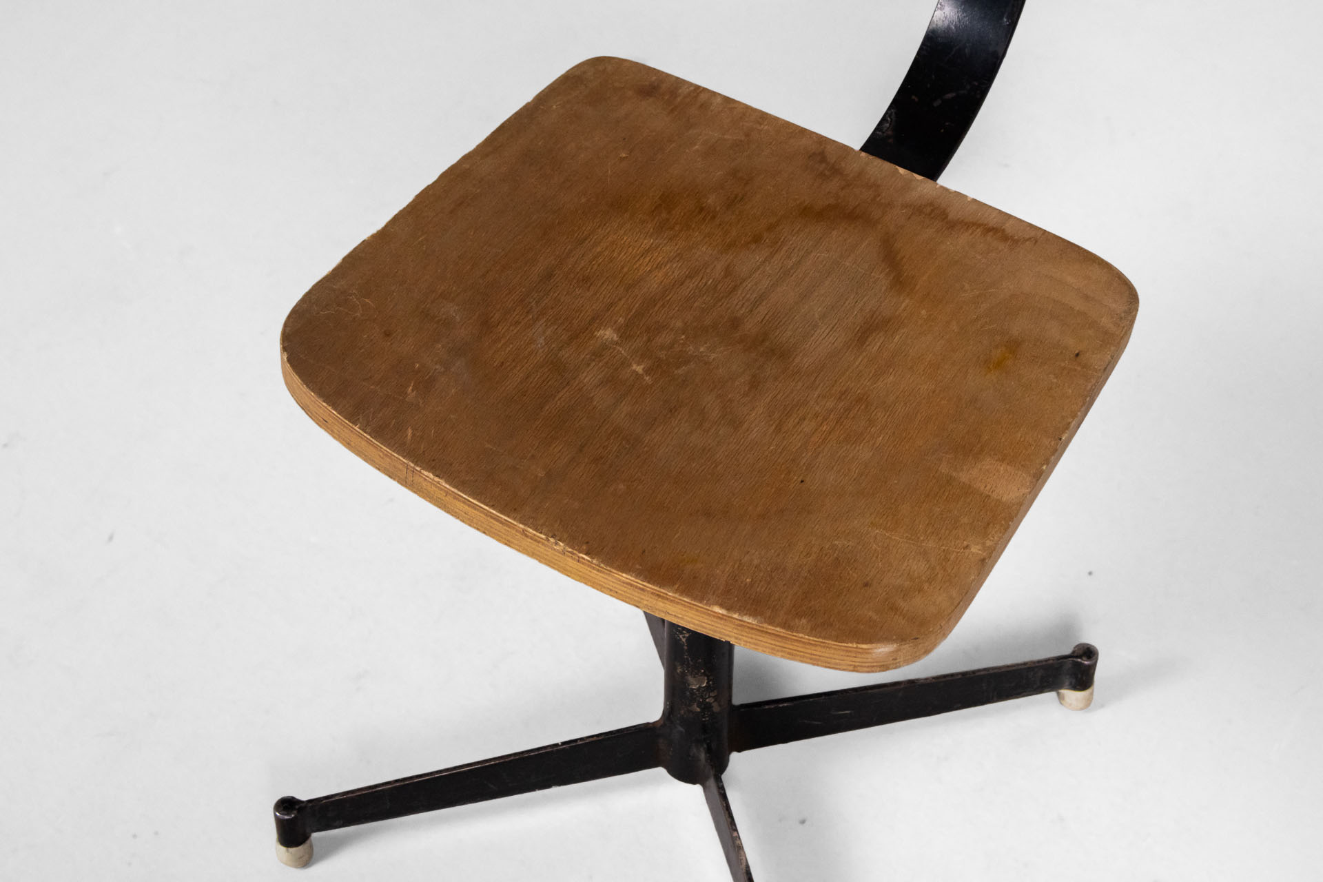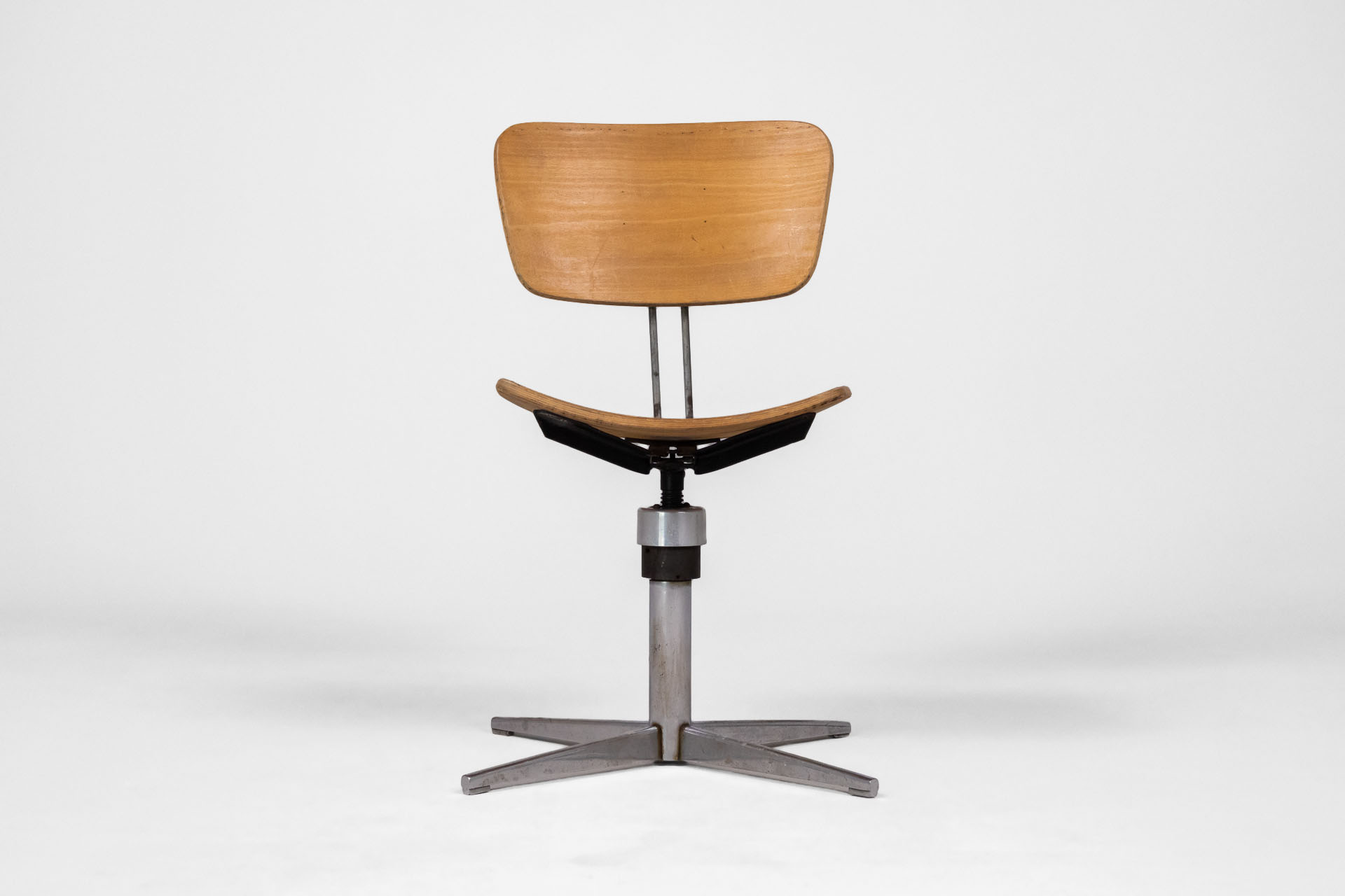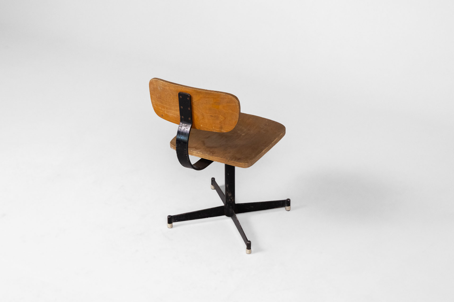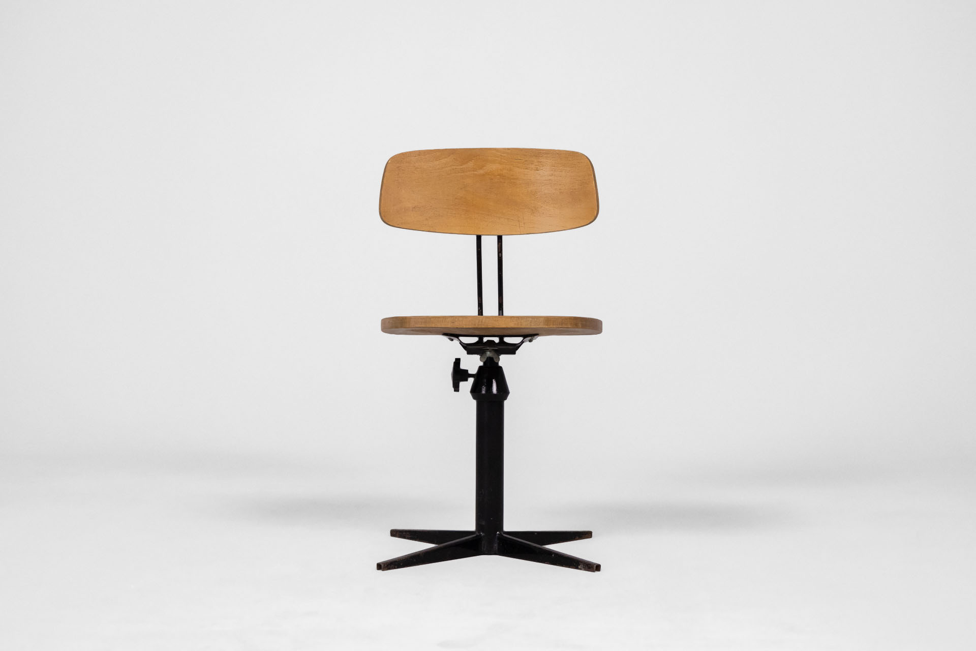 Modern, funkcionális forgószék, amely fém vázzal és ergonomikus, ívelt formájú fa ülőfelülettel rendelkezik. A szék színe meleg, természetes fa árnyalat, amely kellemes kontrasztot alkot a fekete fém lábakkal....
