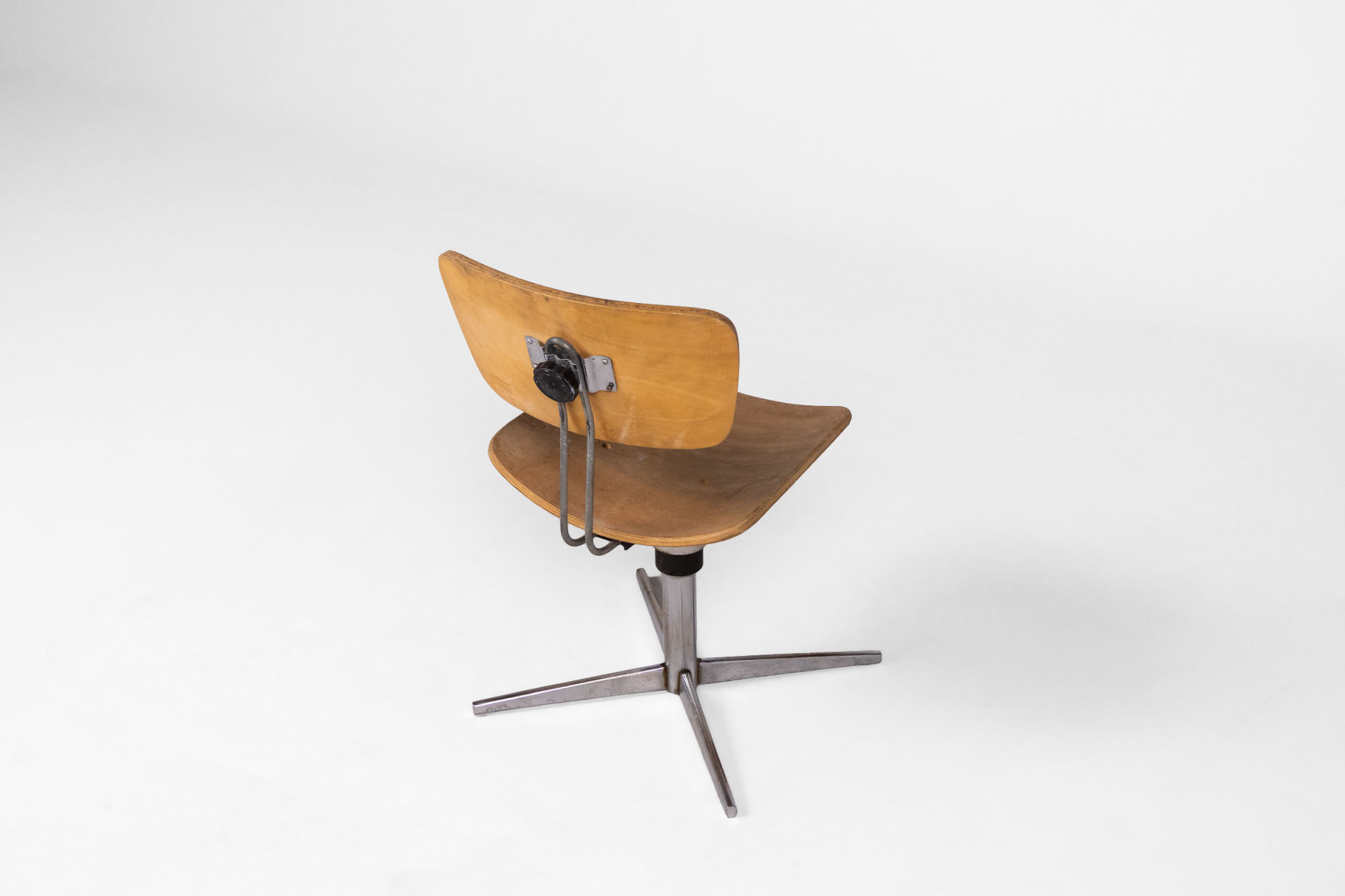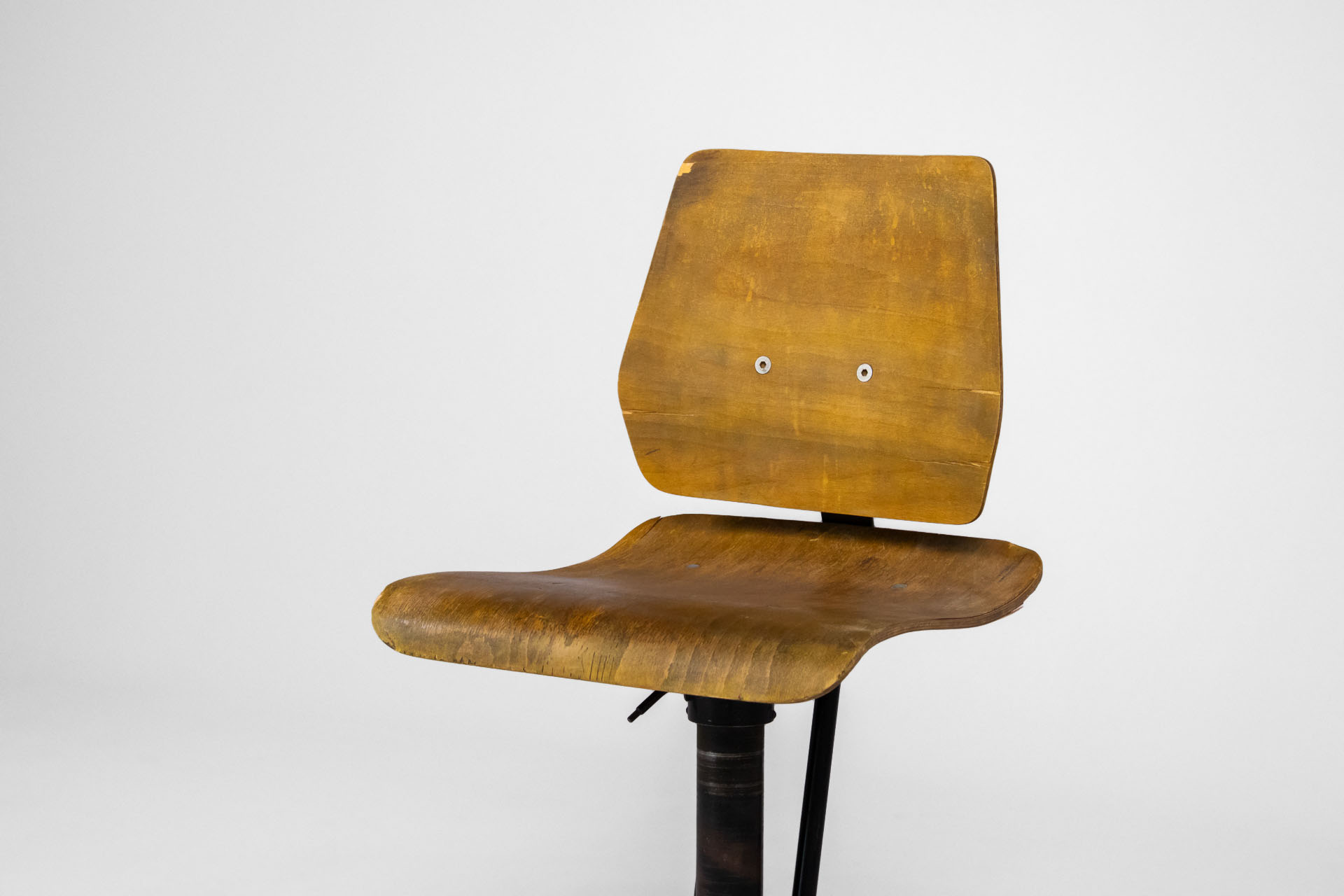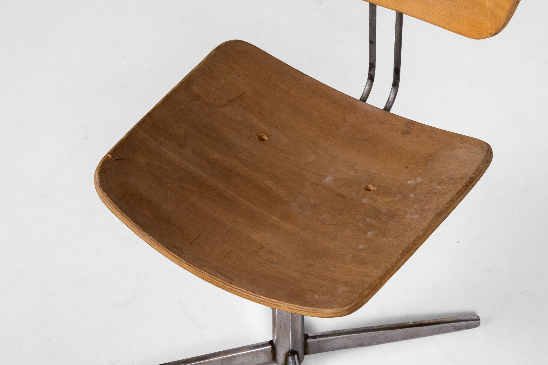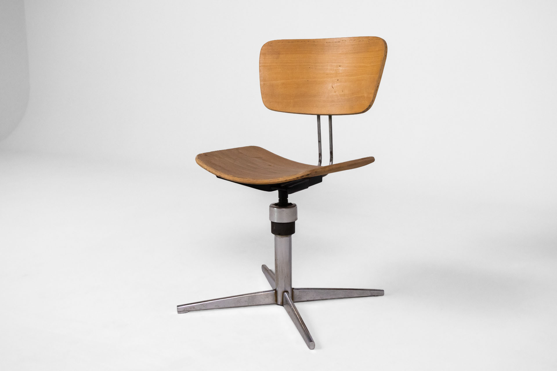 Modern, funkcionális forgószék, amely fém vázzal és ergonomikus, ívelt formájú fa ülőfelülettel rendelkezik. A szék színe meleg, természetes fa árnyalat, amely kellemes kontrasztot alkot a fekete fém lábakkal....