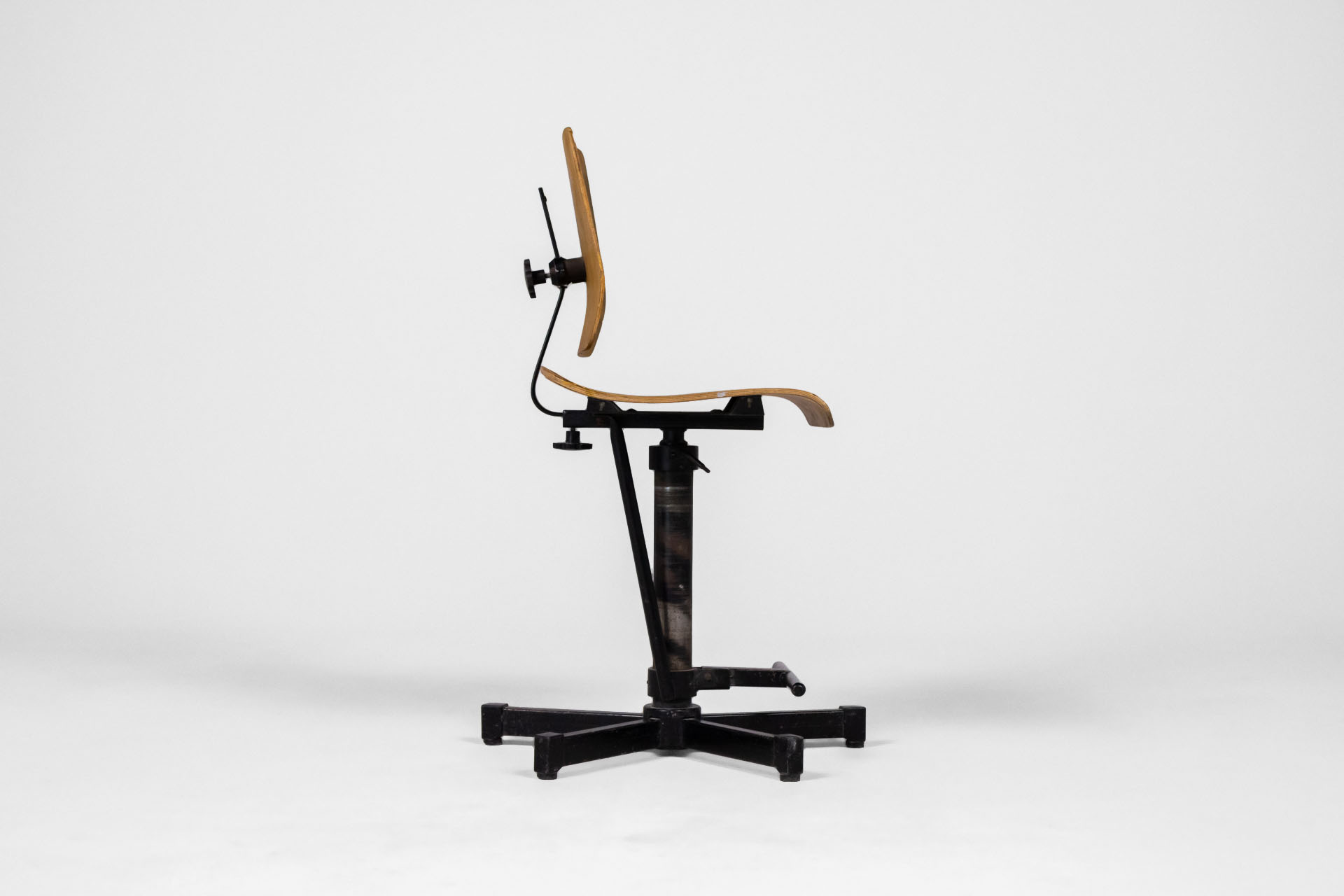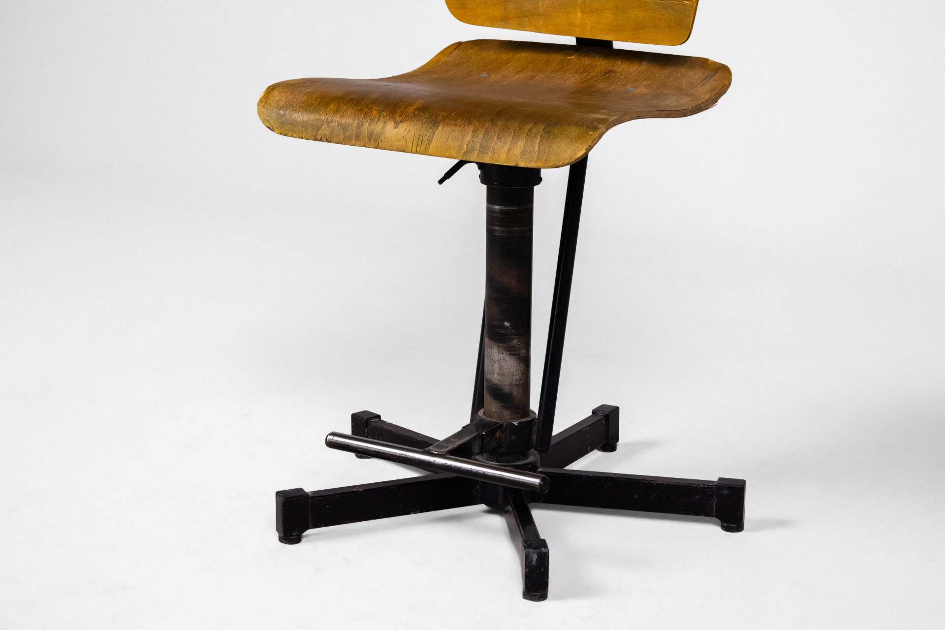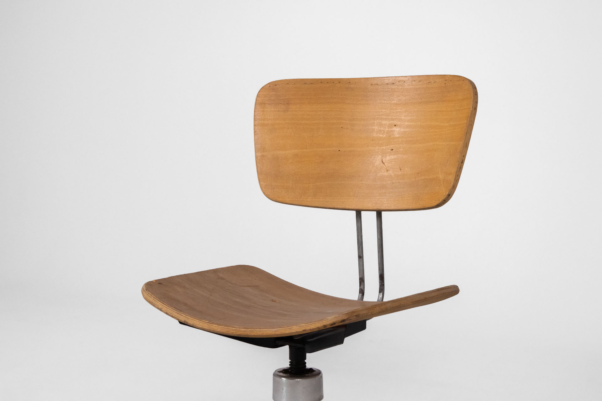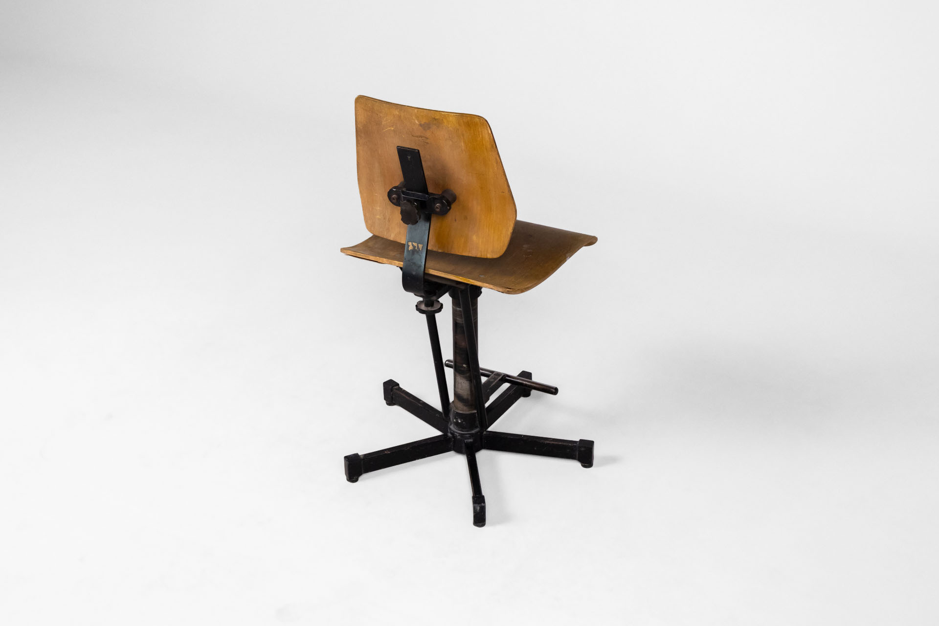 Modern, funkcionális forgószék, amely fém vázzal és ergonomikus, ívelt formájú fa ülőfelülettel rendelkezik. A szék színe meleg, természetes fa árnyalat, amely kellemes kontrasztot alkot a fekete fém lábakkal....