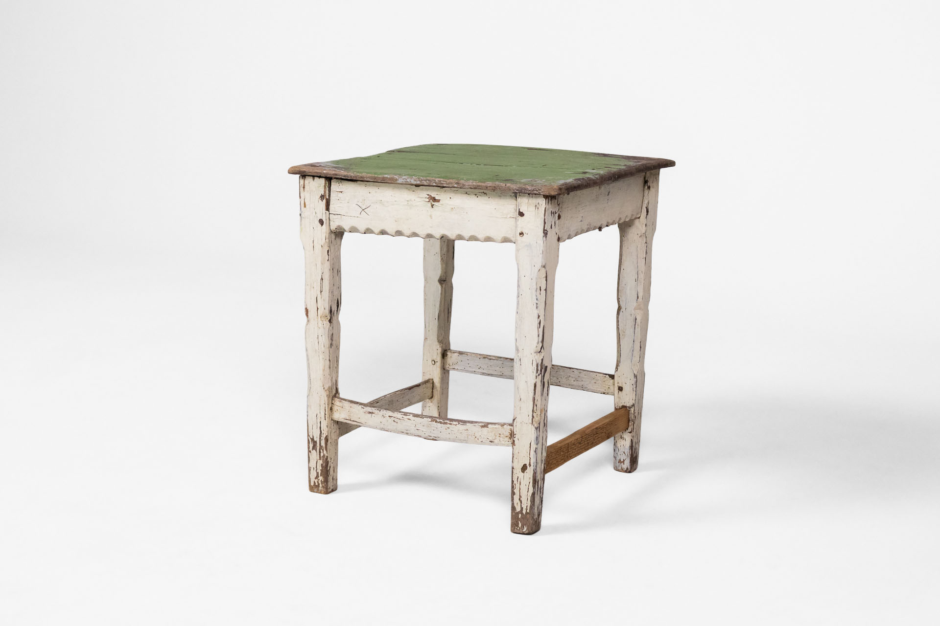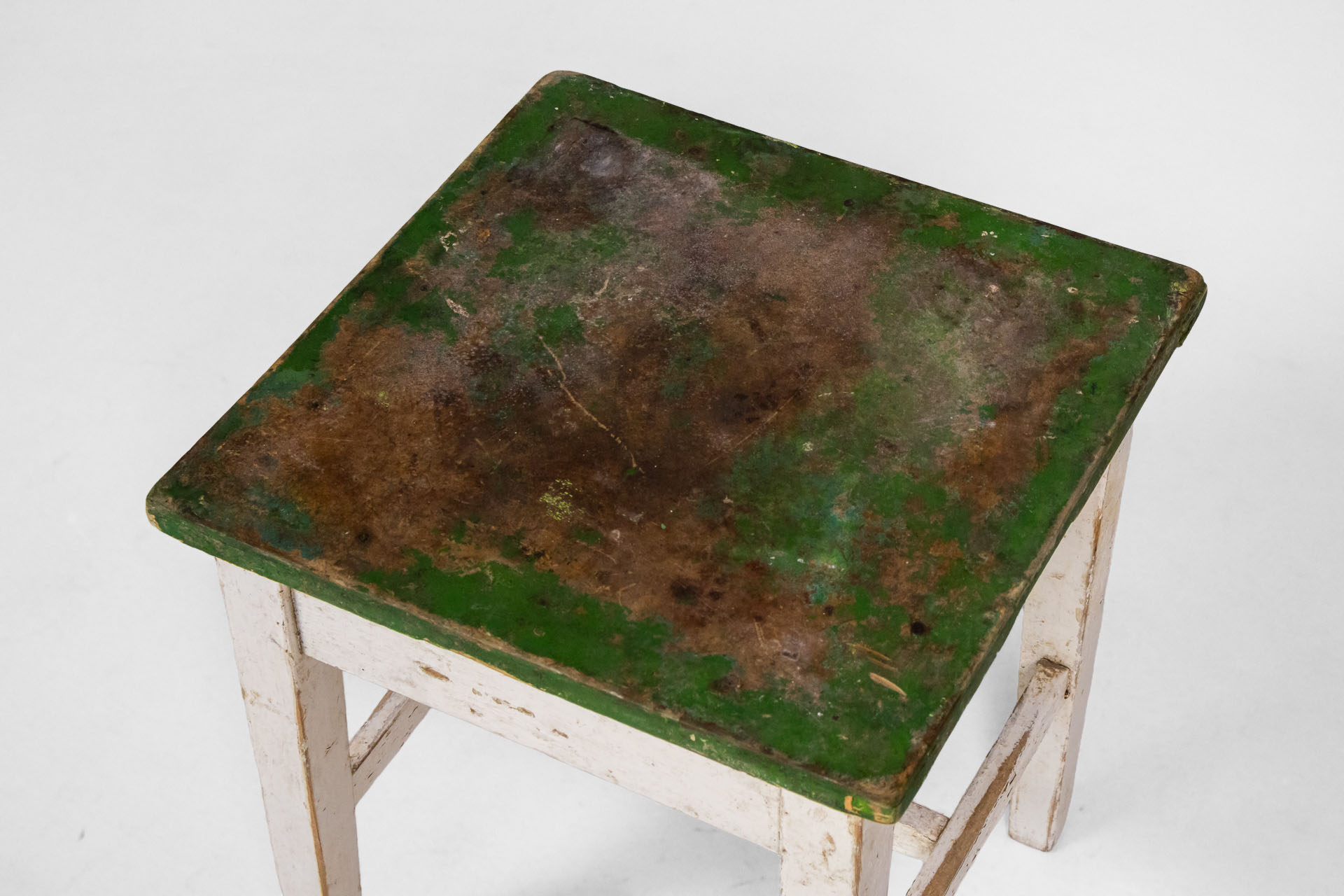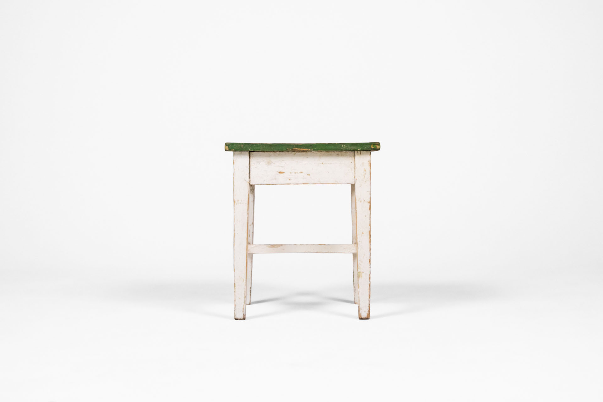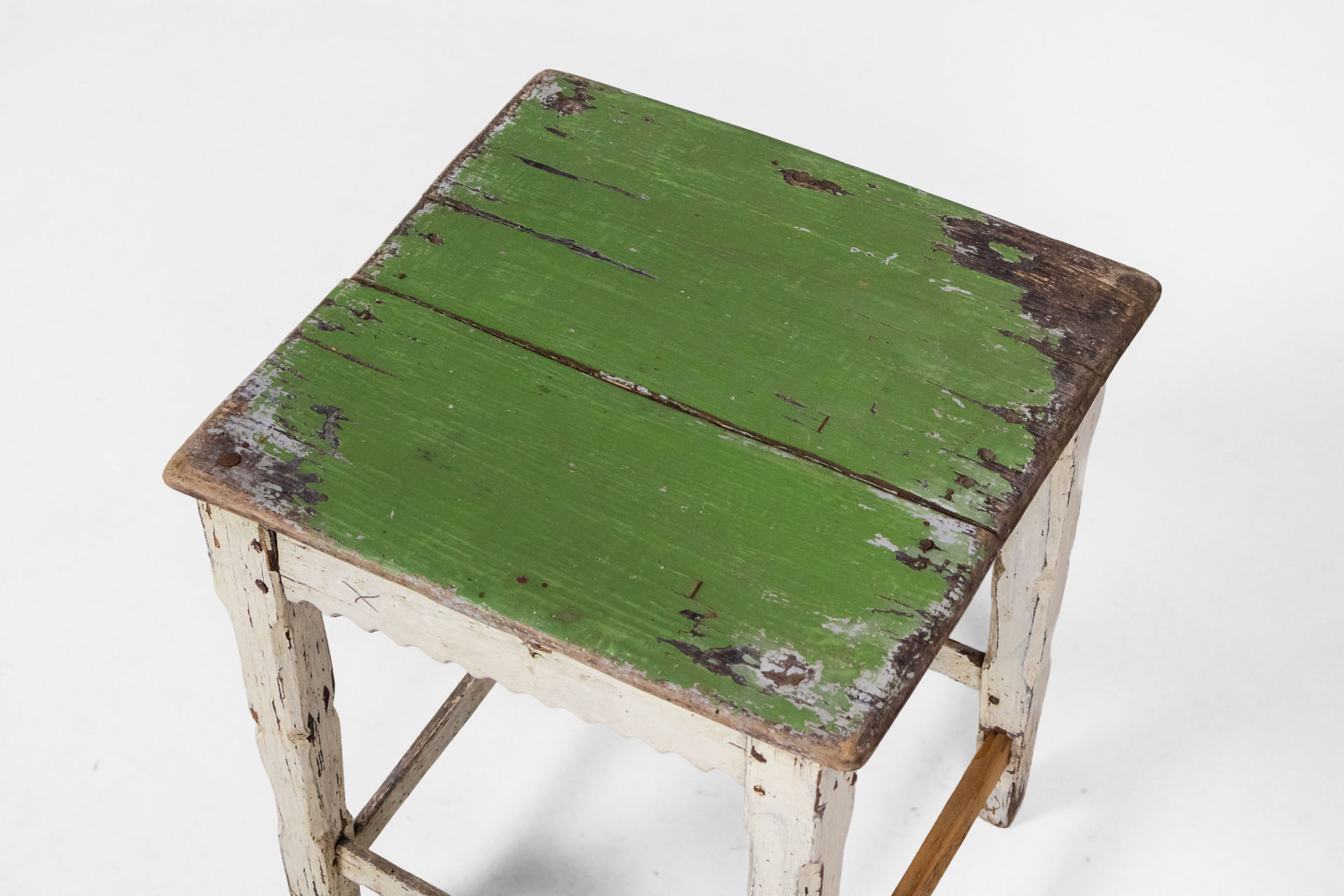 Egyszerű, rusztikus stílusú hokedli, amelynek zöld festett teteje és fehérre mázolt lábai vintage megjelenést kölcsönöznek. A természetes kopások időtlen karaktert adnak, ideális díszlet bármilyen történelmi vagy...