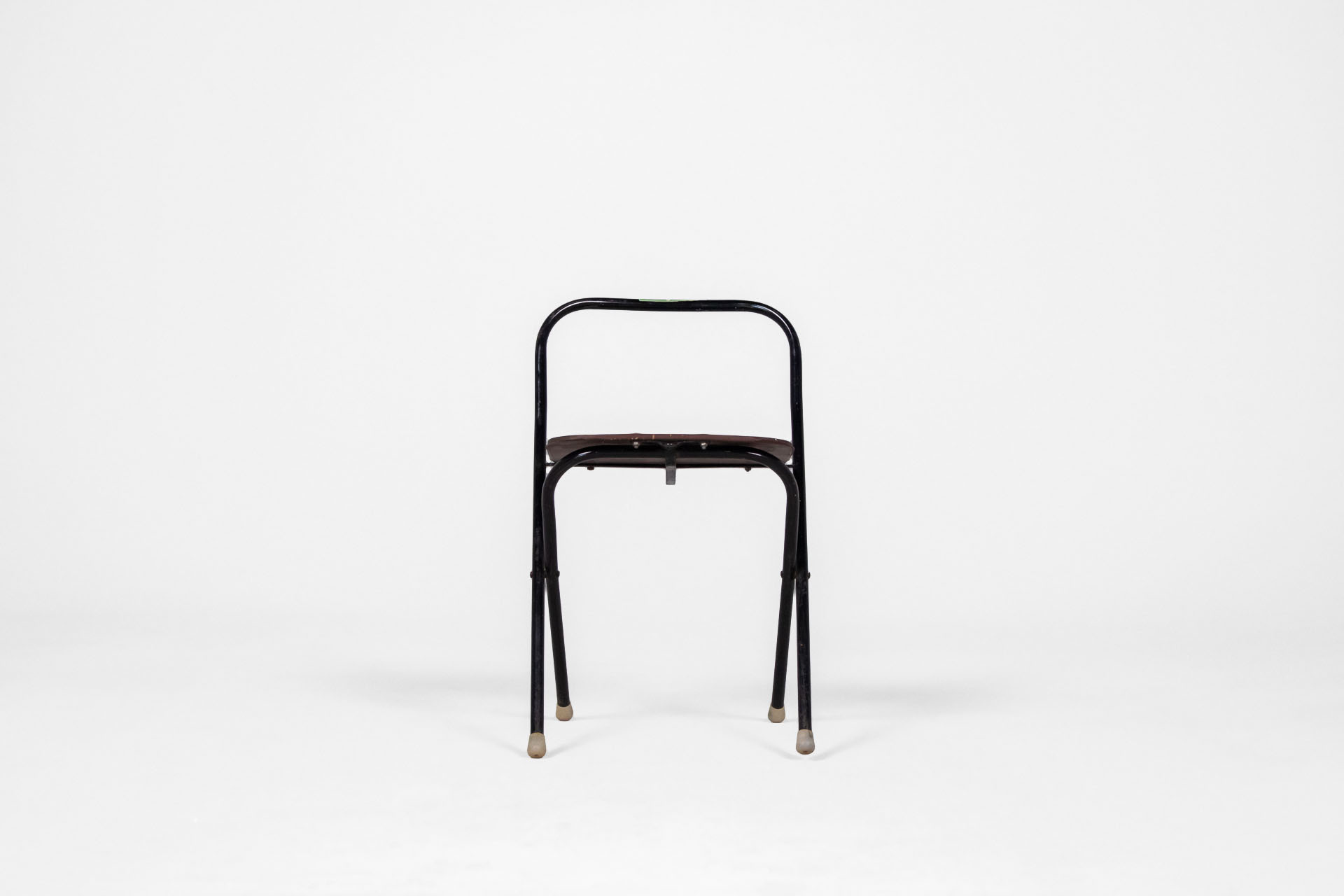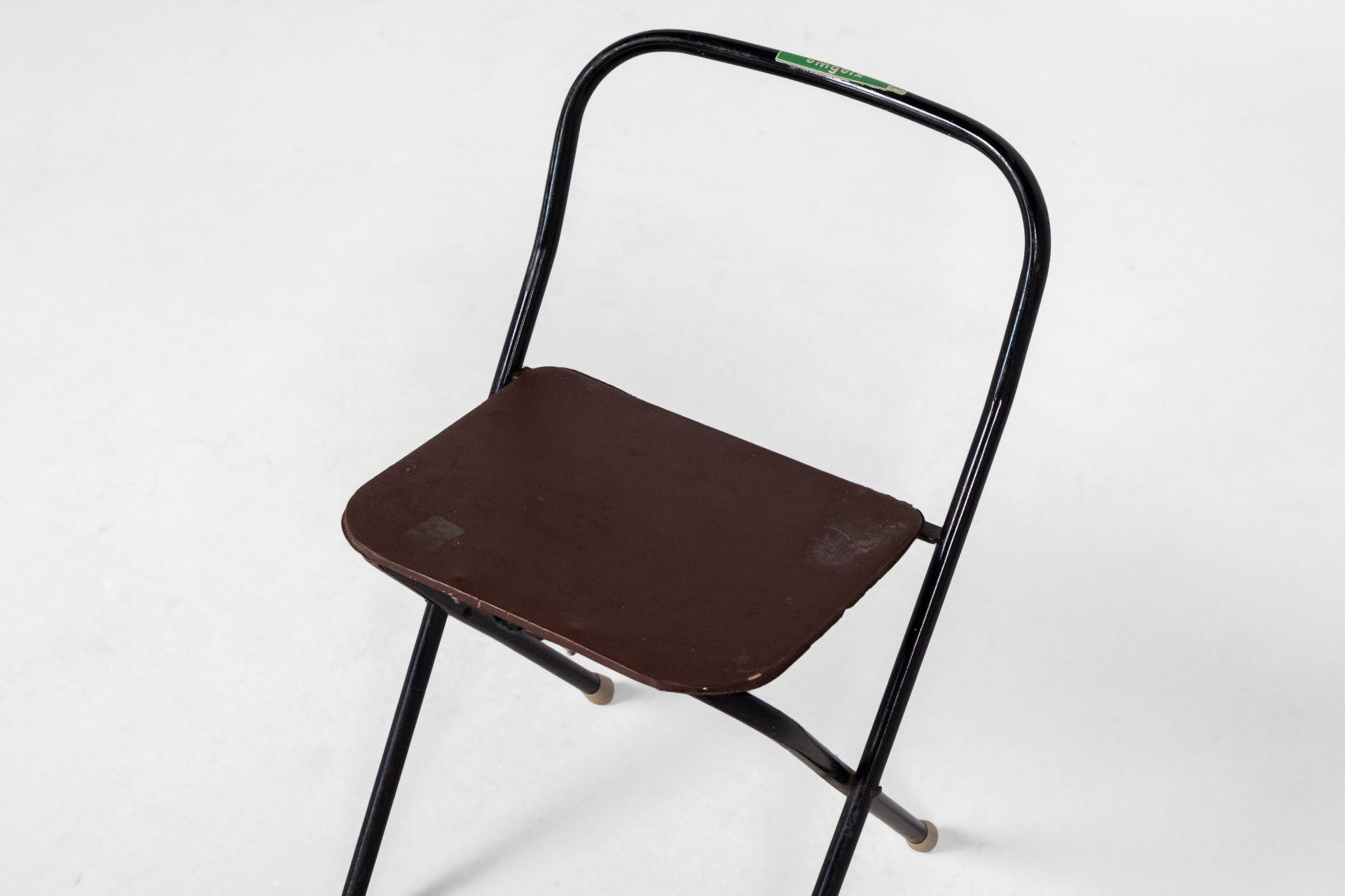 Praktikus, összecsukható fém szék. A sötétbarna ülőfelület és a fekete fém váz egységet alkot