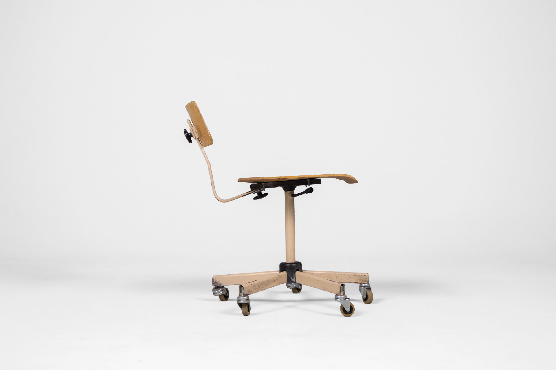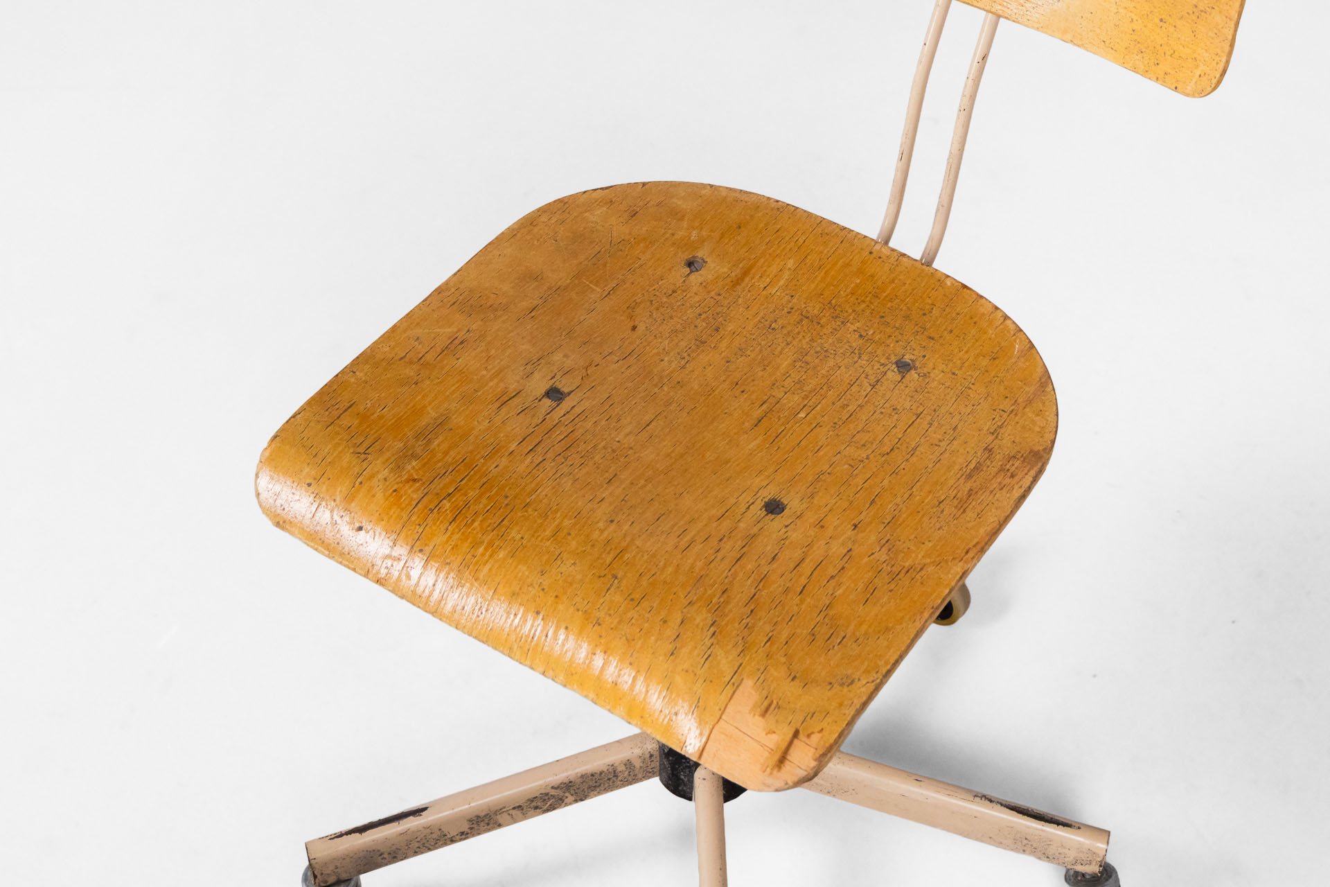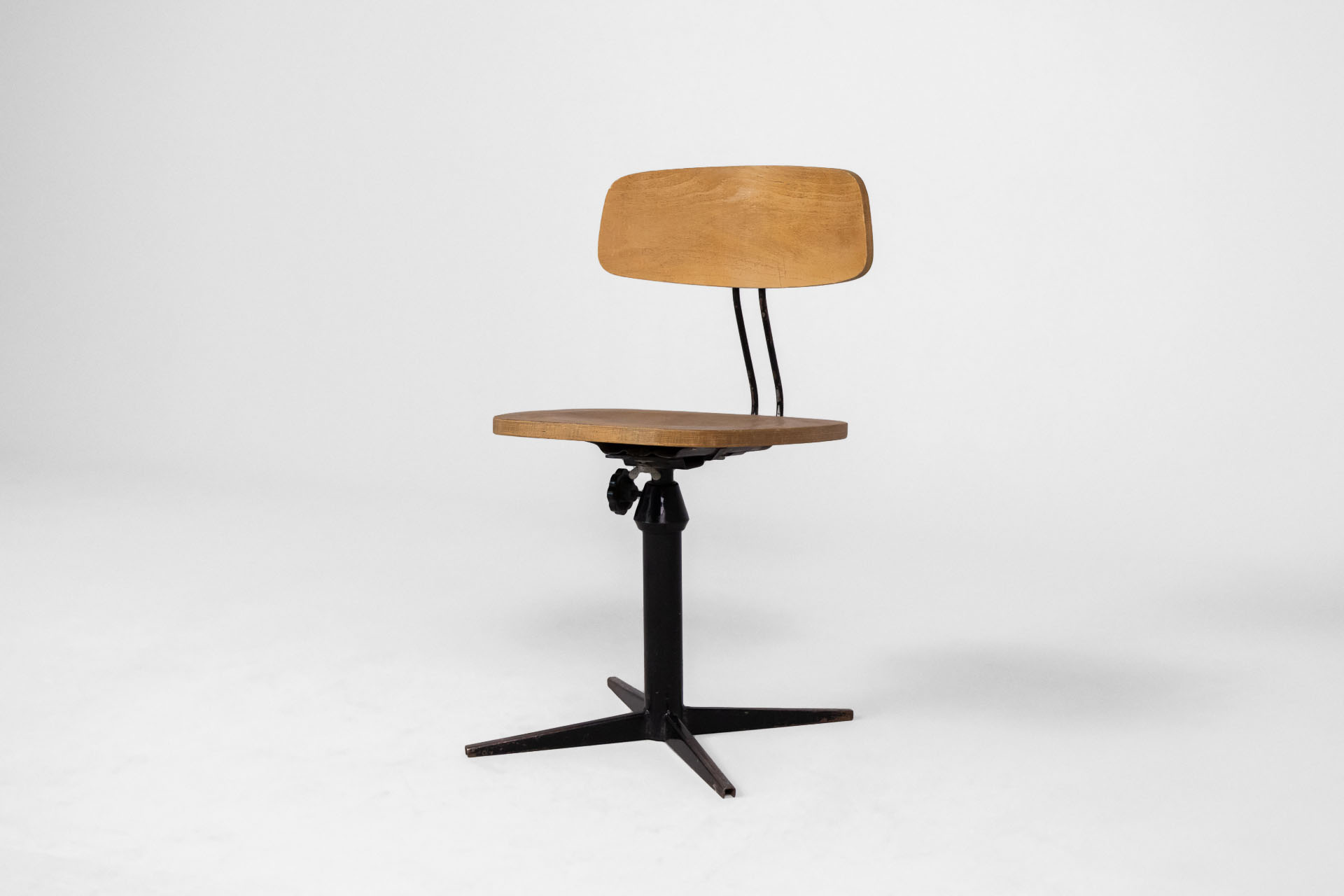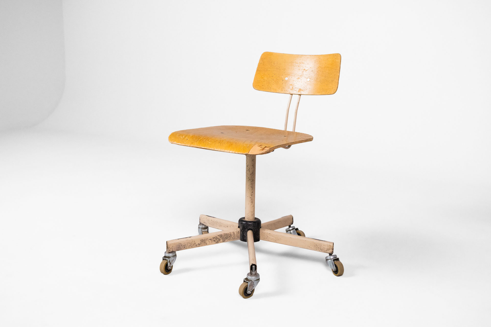 Praktikus, vintage stílusú gurulós íróasztali szék, amely egyszerű, de funkcionális kialakításával ideális választás otthoni irodákhoz vagy kreatív munkakörnyezetekhez. A természetes fából készült ülőfelület és...