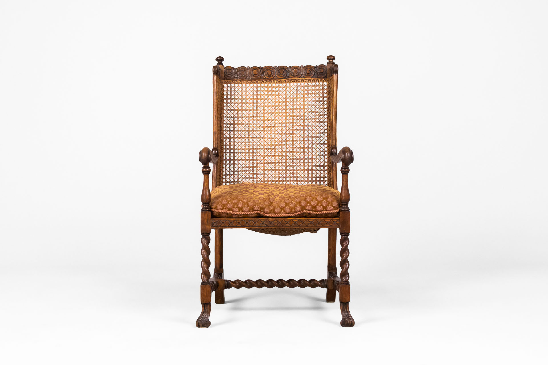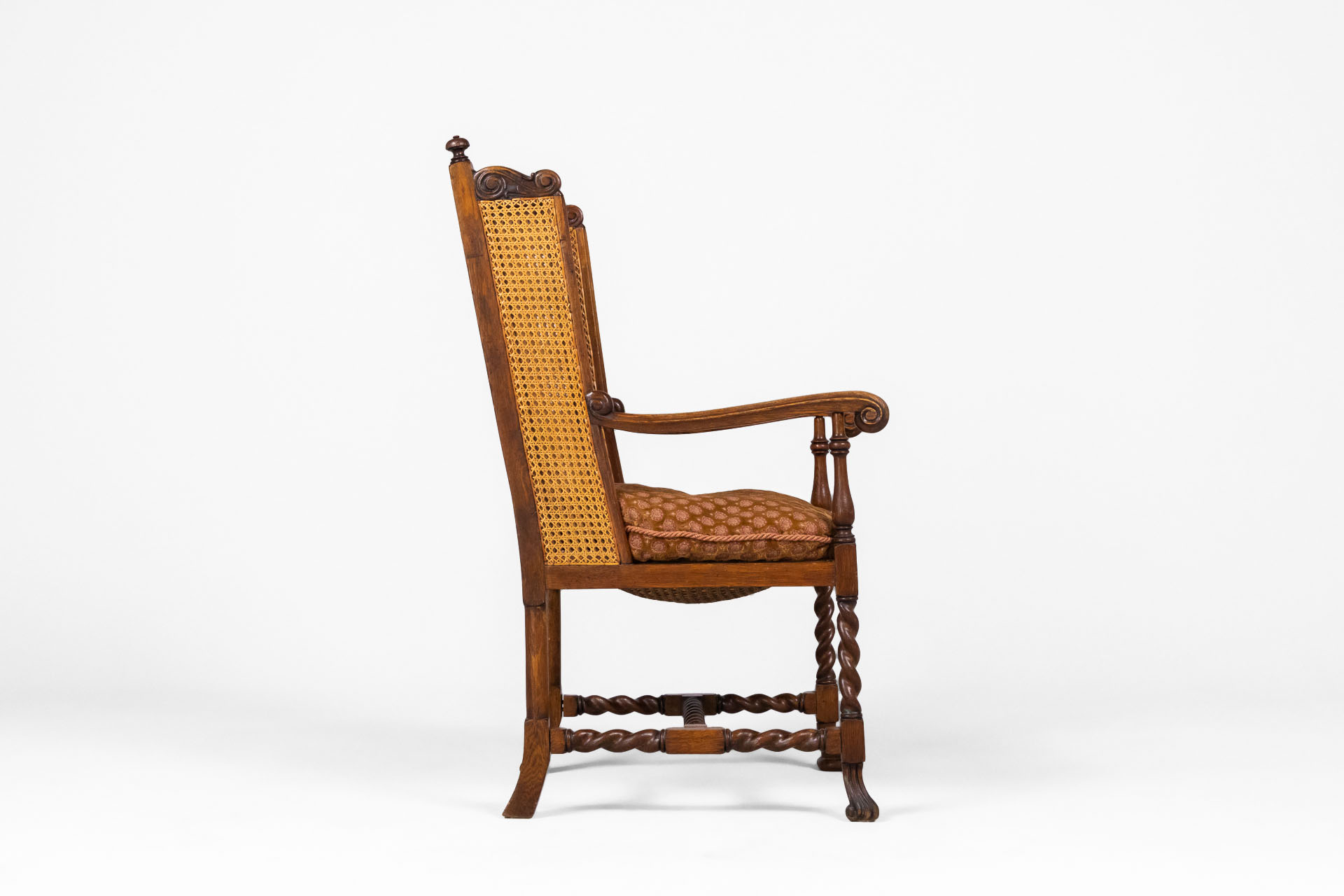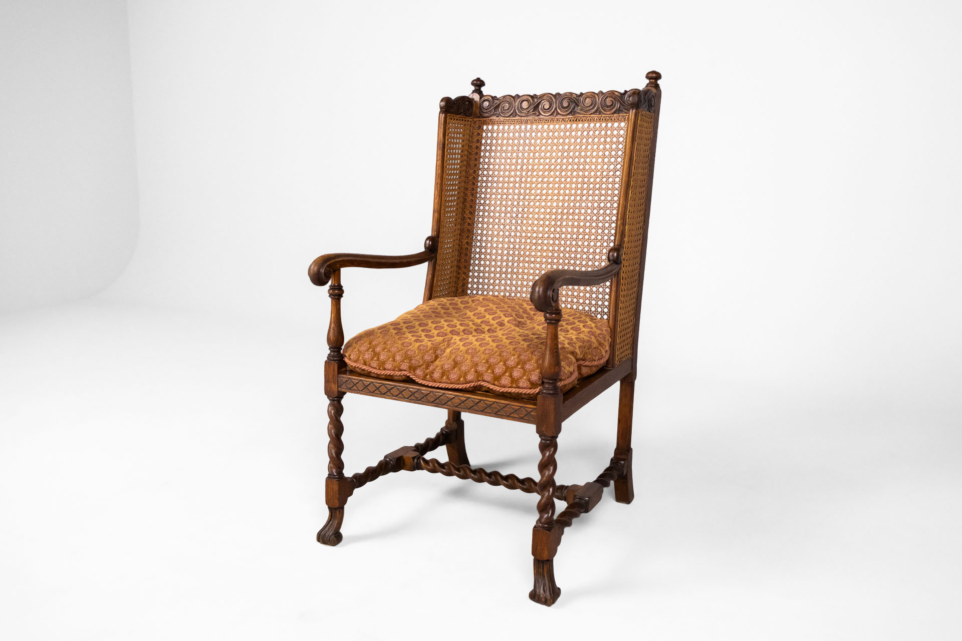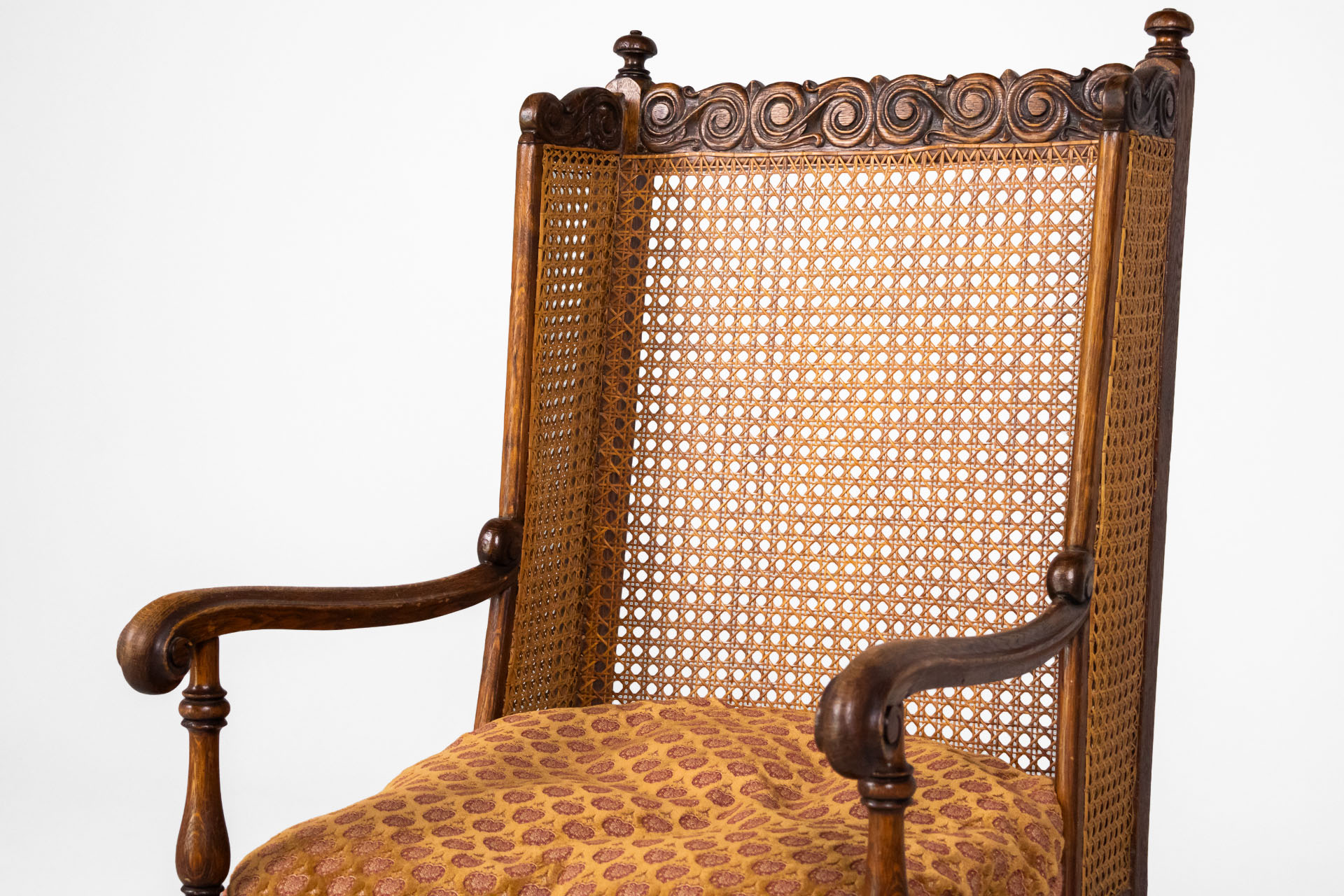 Elegáns, antik stílusú karosszék, amely fonott rattan háttámlával és díszes karfákkal rendelkezik. A puha, mintás párna kényelmes ülést biztosít, míg a gazdagon faragott fa szerkezet időtlen szépséget kölcsönöz a bútornak