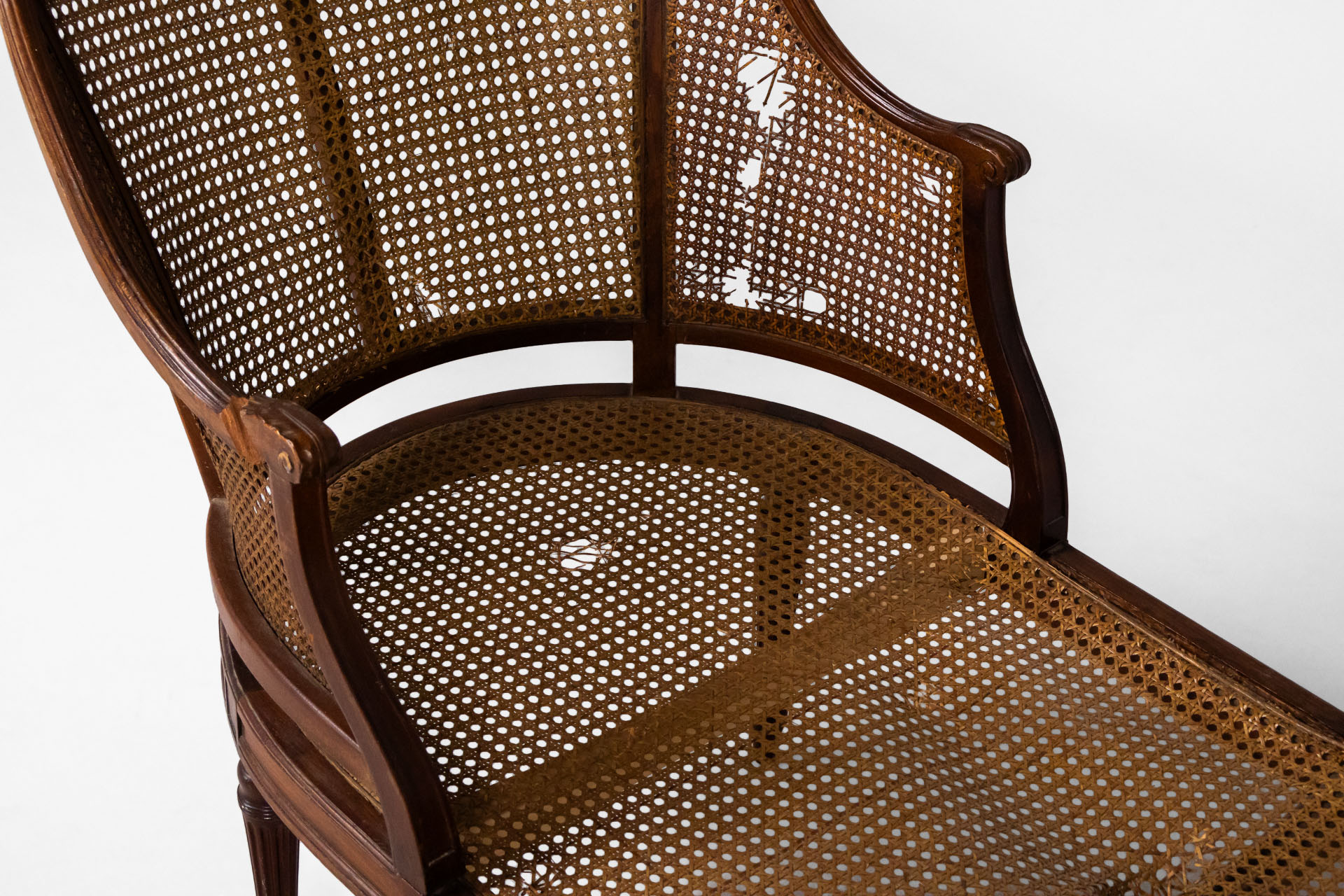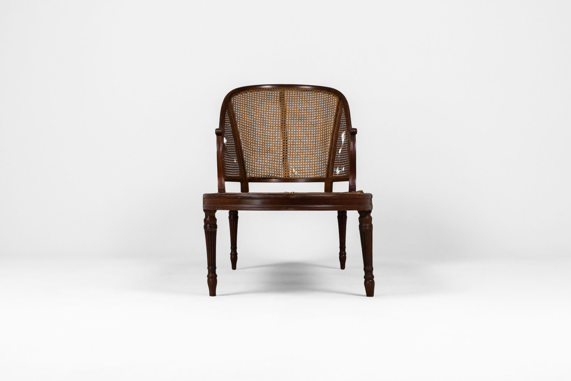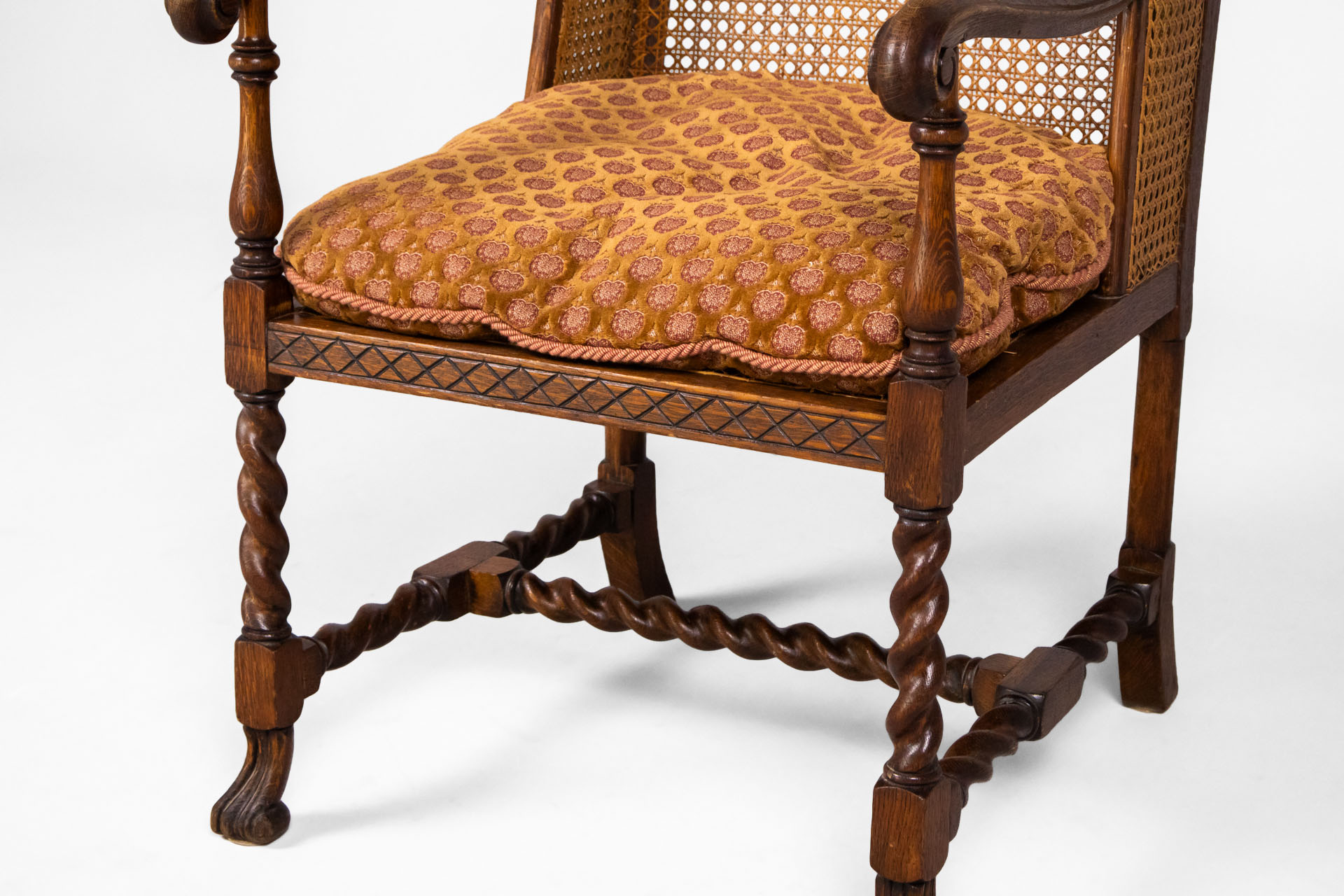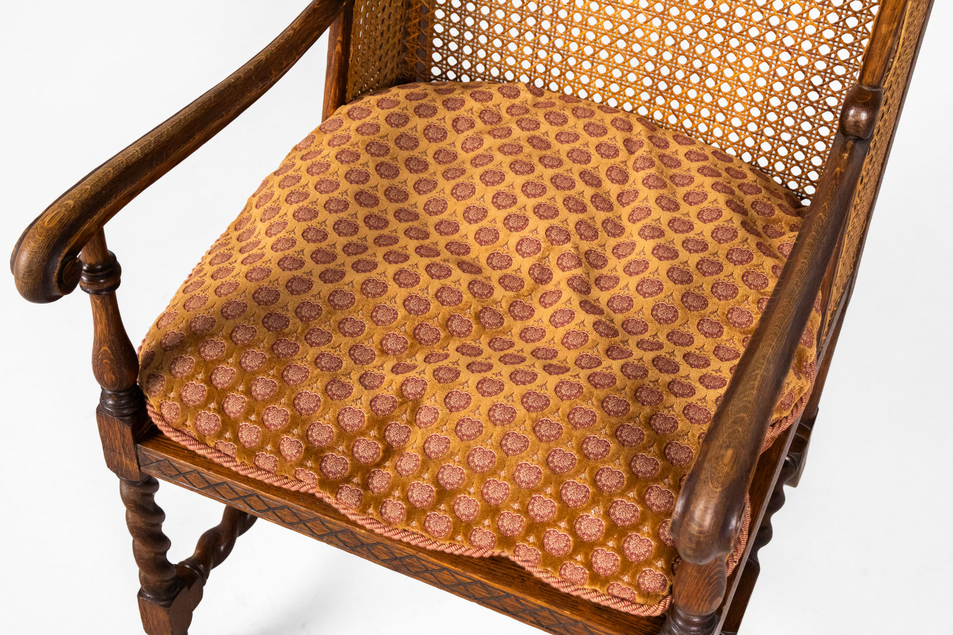 Elegáns, antik stílusú karosszék, amely fonott rattan háttámlával és díszes karfákkal rendelkezik. A puha, mintás párna kényelmes ülést biztosít, míg a gazdagon faragott fa szerkezet időtlen szépséget kölcsönöz a bútornak