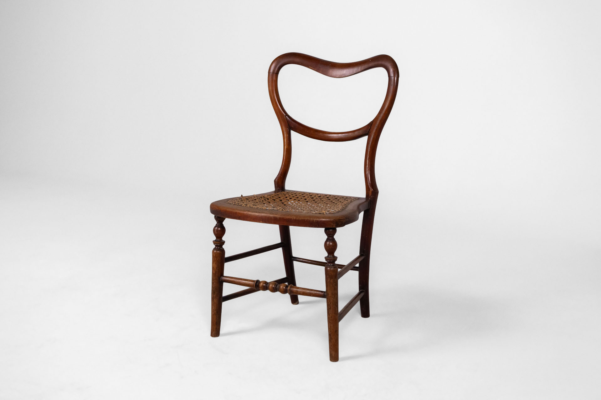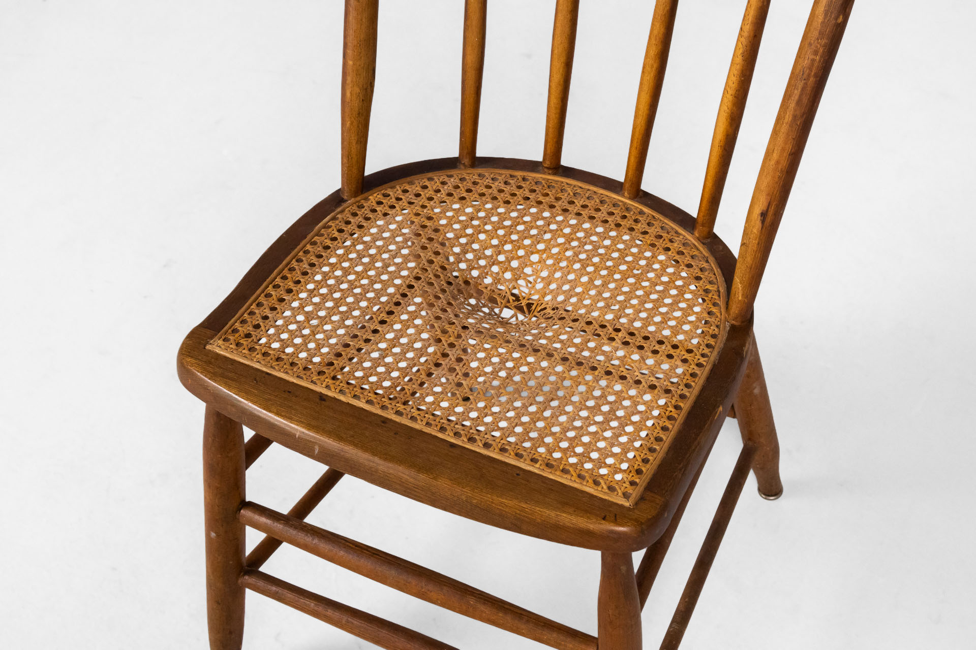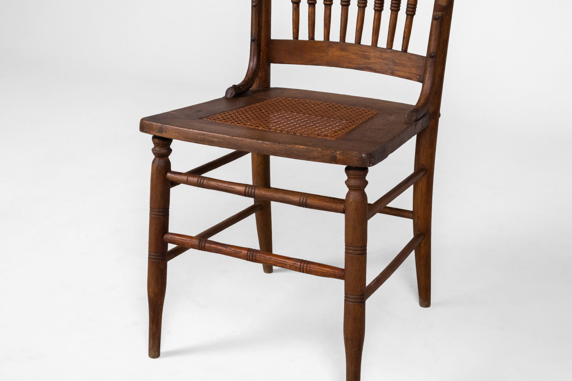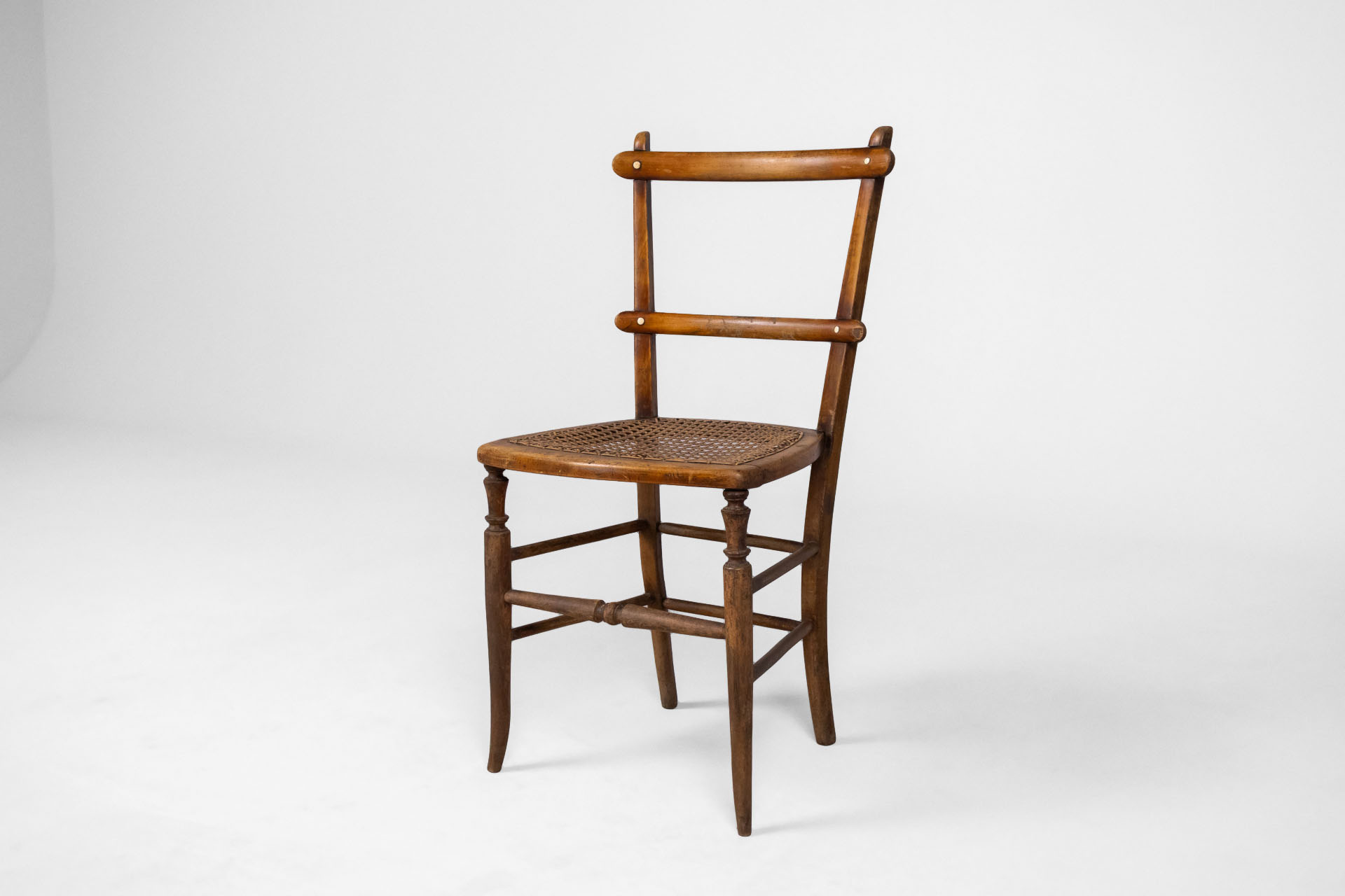 Elegáns, vintage stílusú szék, amely fonott ülőfelülettel rendelkezik. A masszív, fából készült szerkezet időtálló és stabil, ideális választás bármely retro vagy klasszikus enteriőrbe