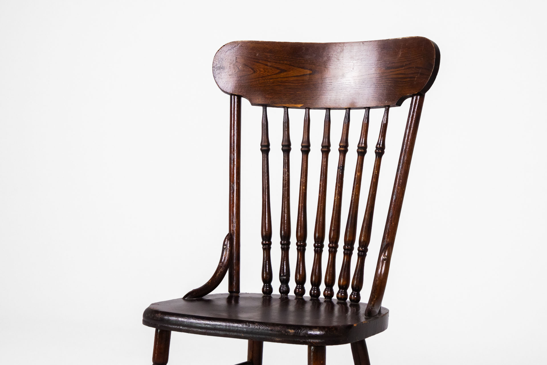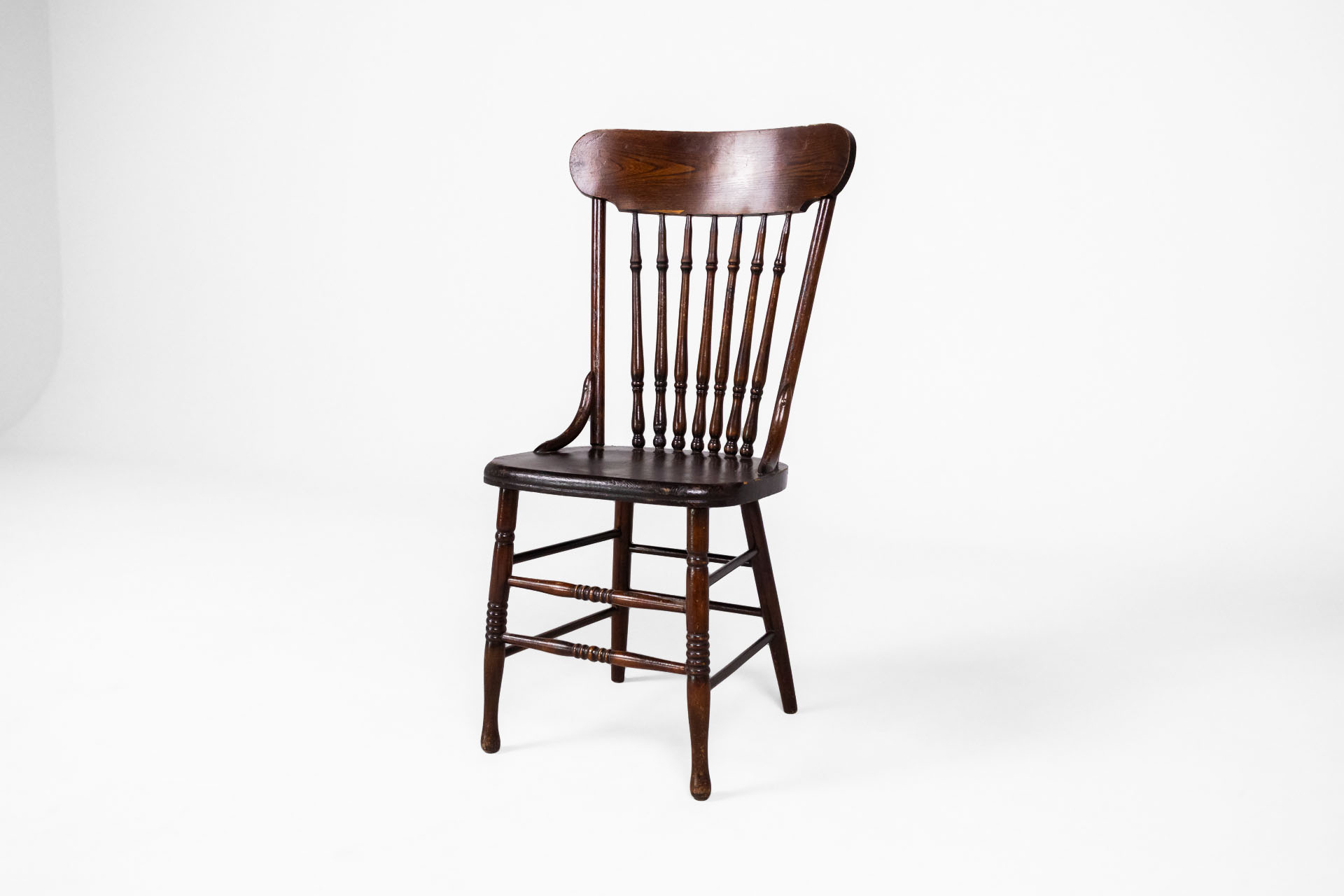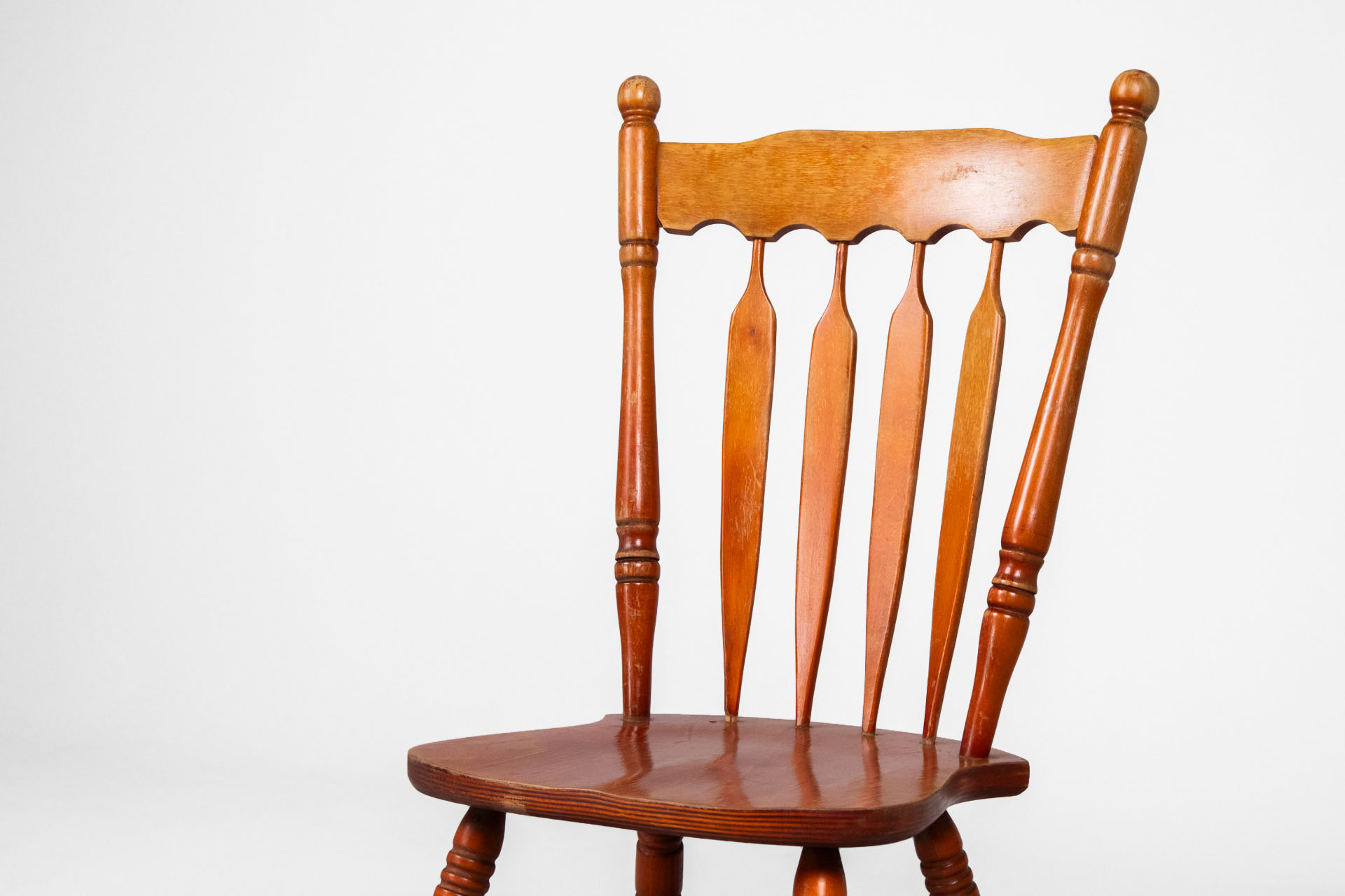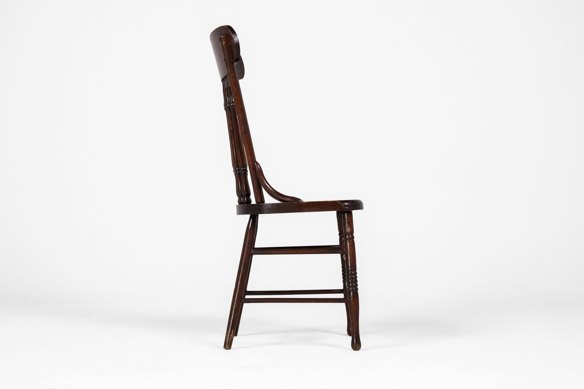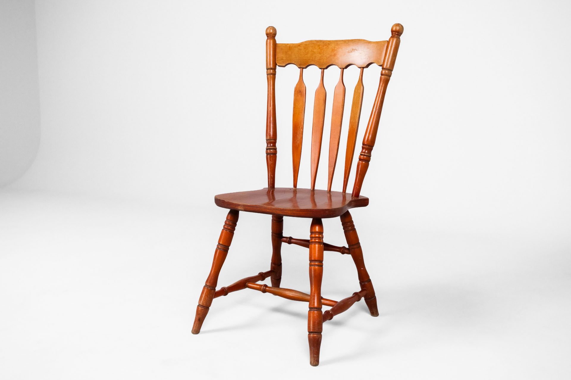 Tradicionális stílusú, vintage fa étkezőszék, amely klasszikus, ívelt háttámlával rendelkezik. A lakkozás kiemeli a famintázat természetes szépségét