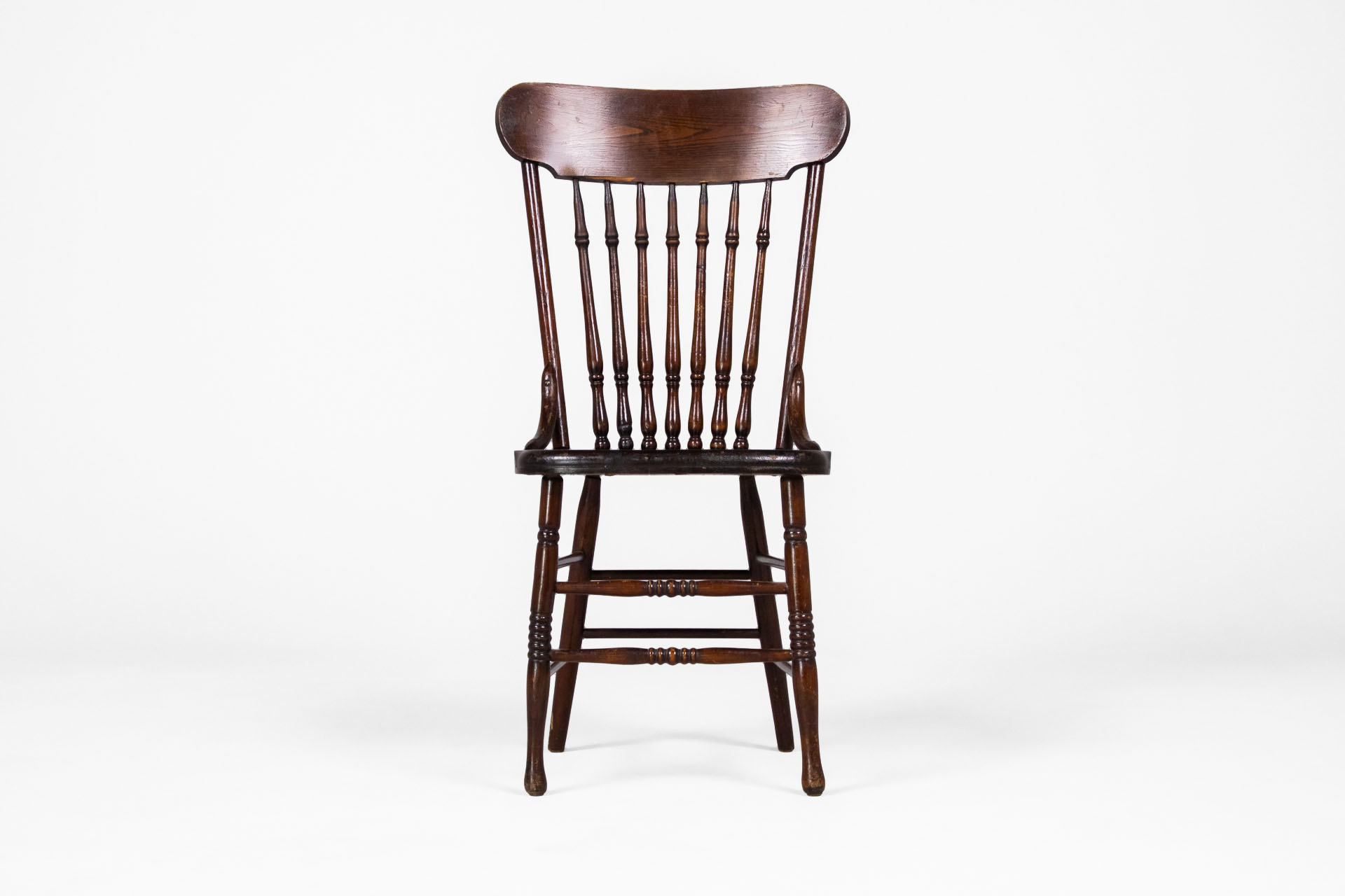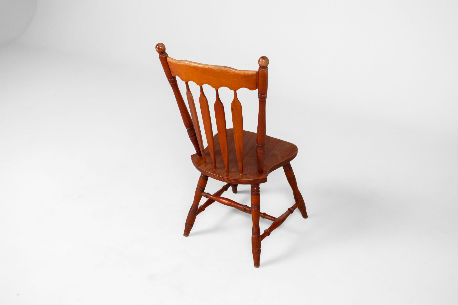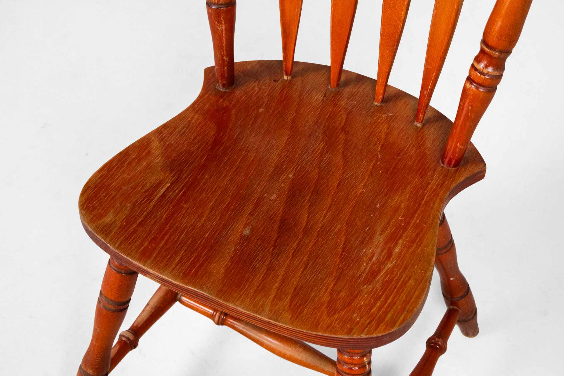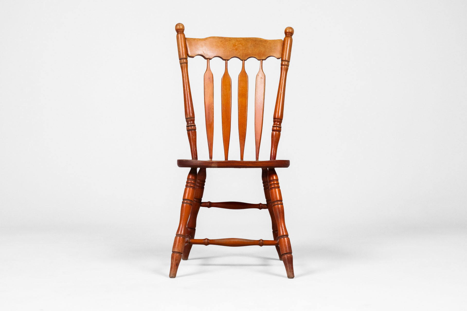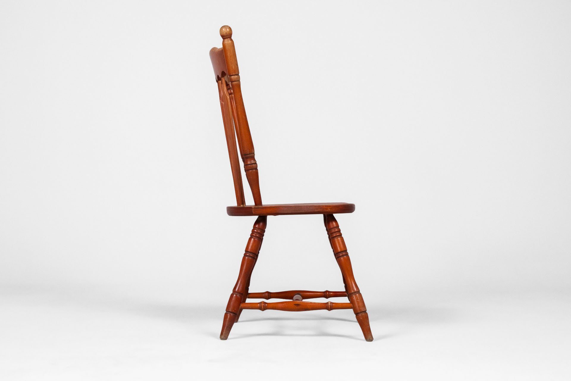 Tradicionális stílusú, vintage fa étkezőszék, amely klasszikus, ívelt háttámlával rendelkezik. A lakkozás kiemeli a famintázat természetes szépségét