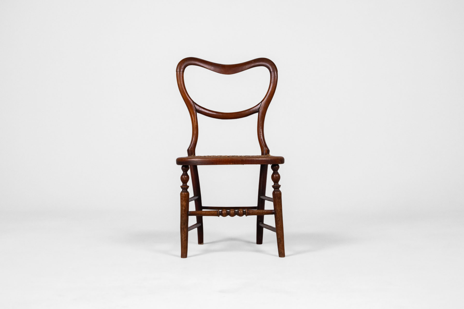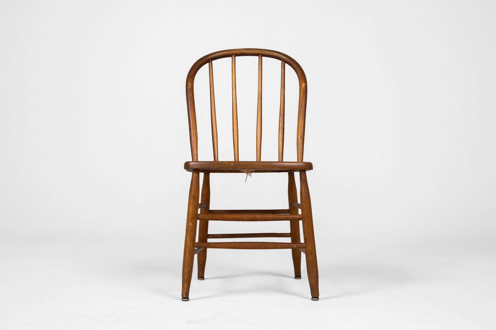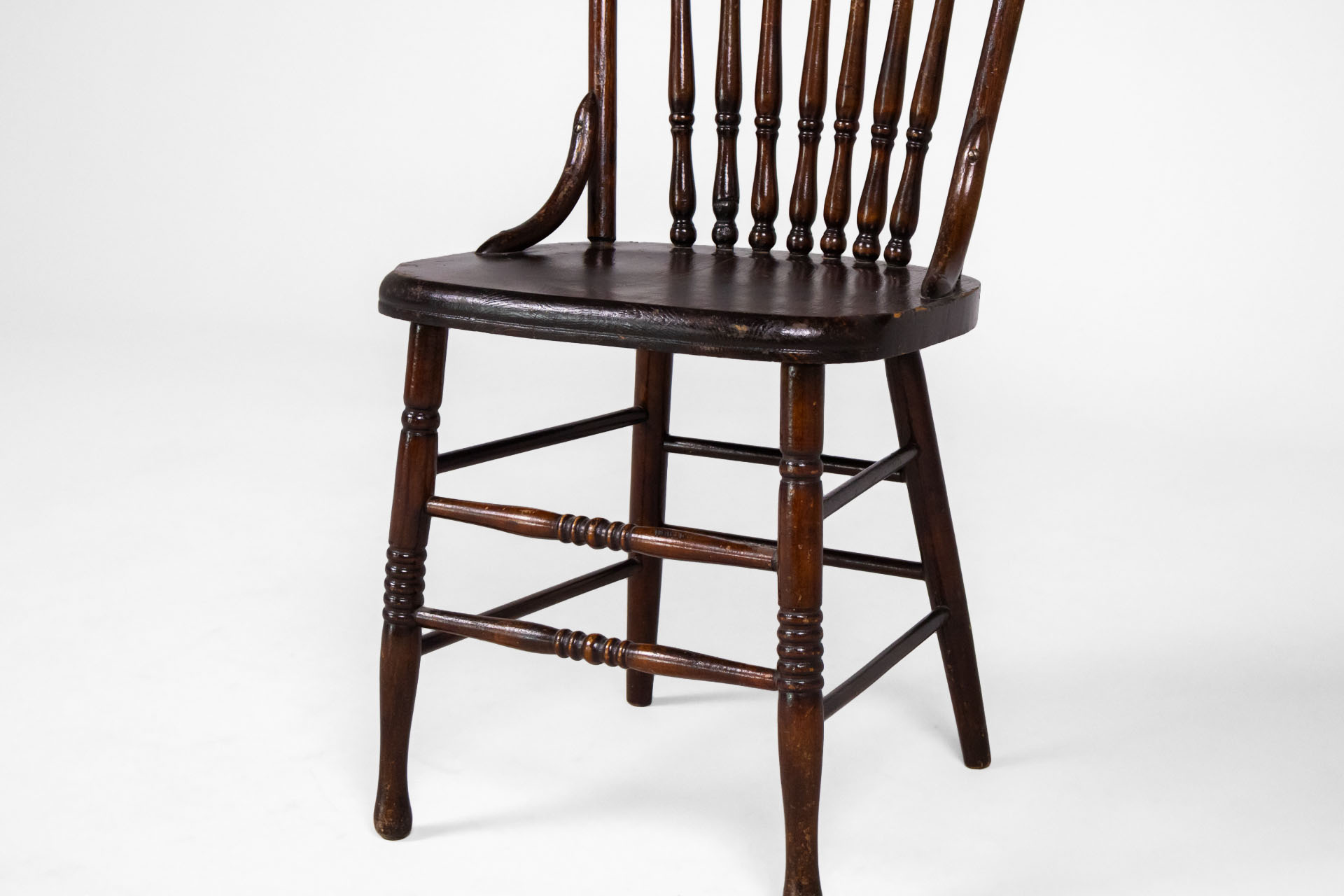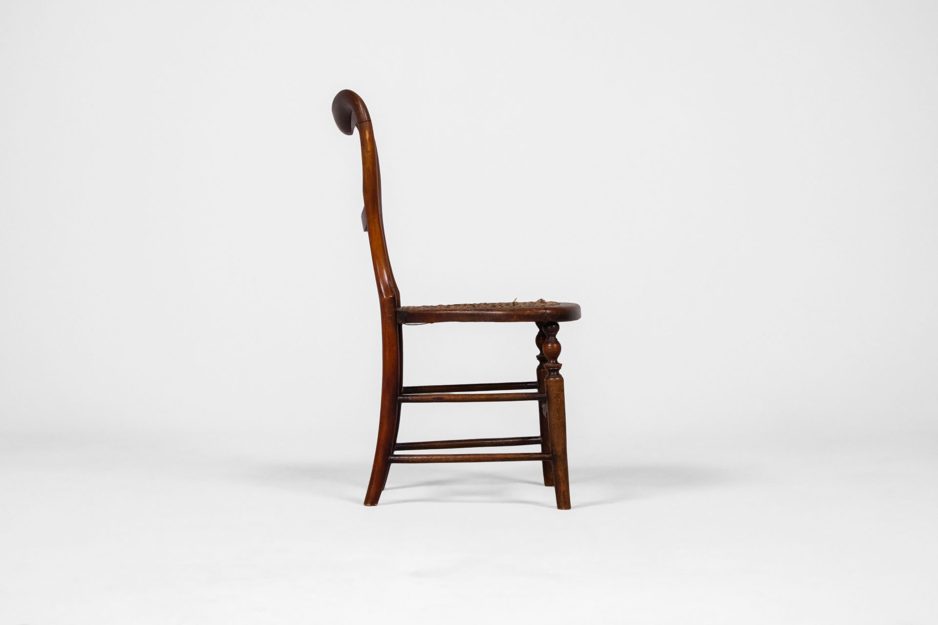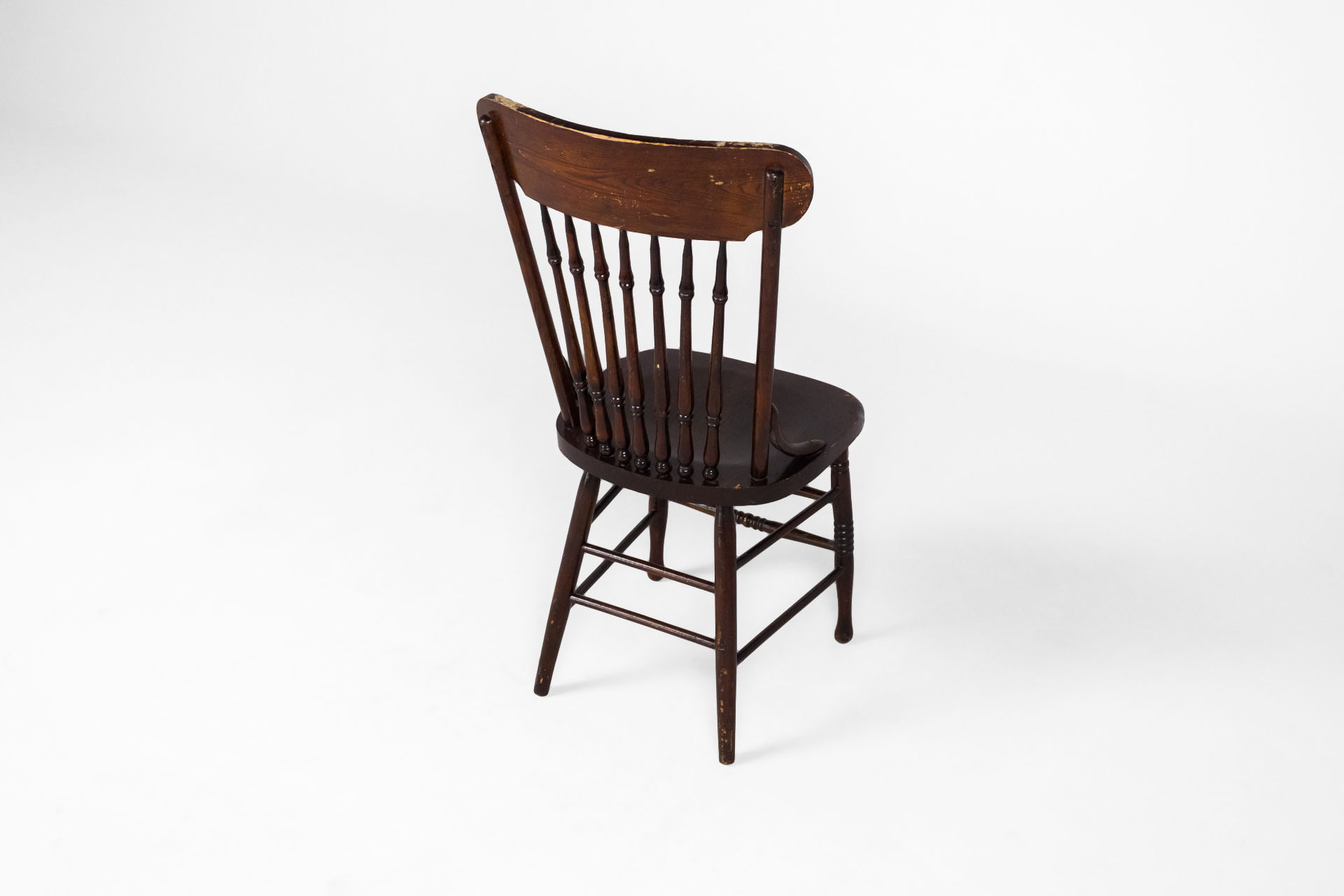 Tradicionális stílusú, vintage fa étkezőszék, amely klasszikus, ívelt háttámlával rendelkezik. A lakkozás kiemeli a famintázat természetes szépségét