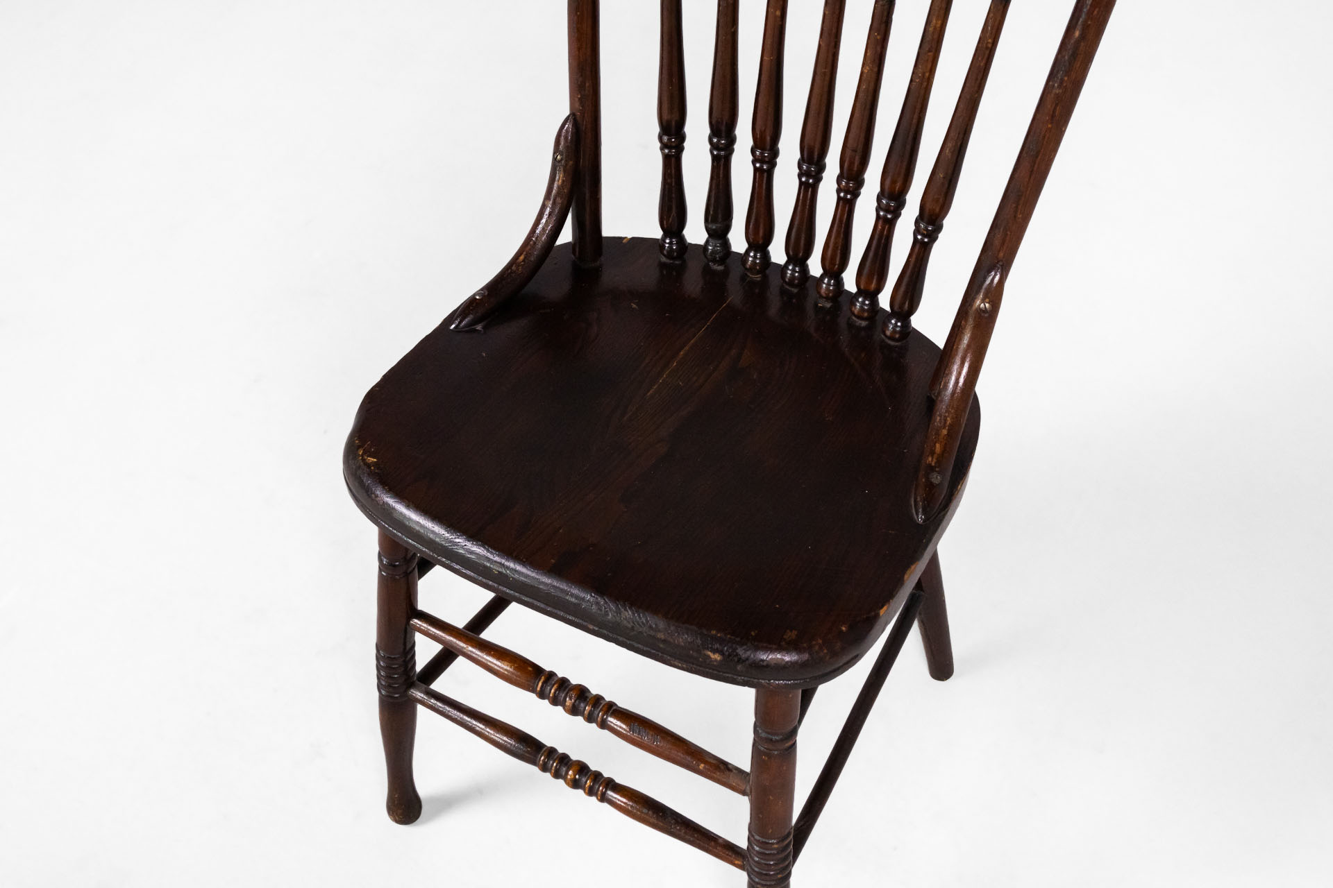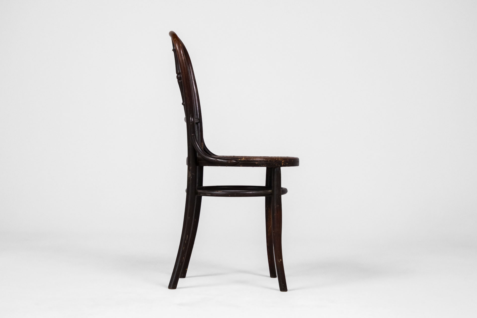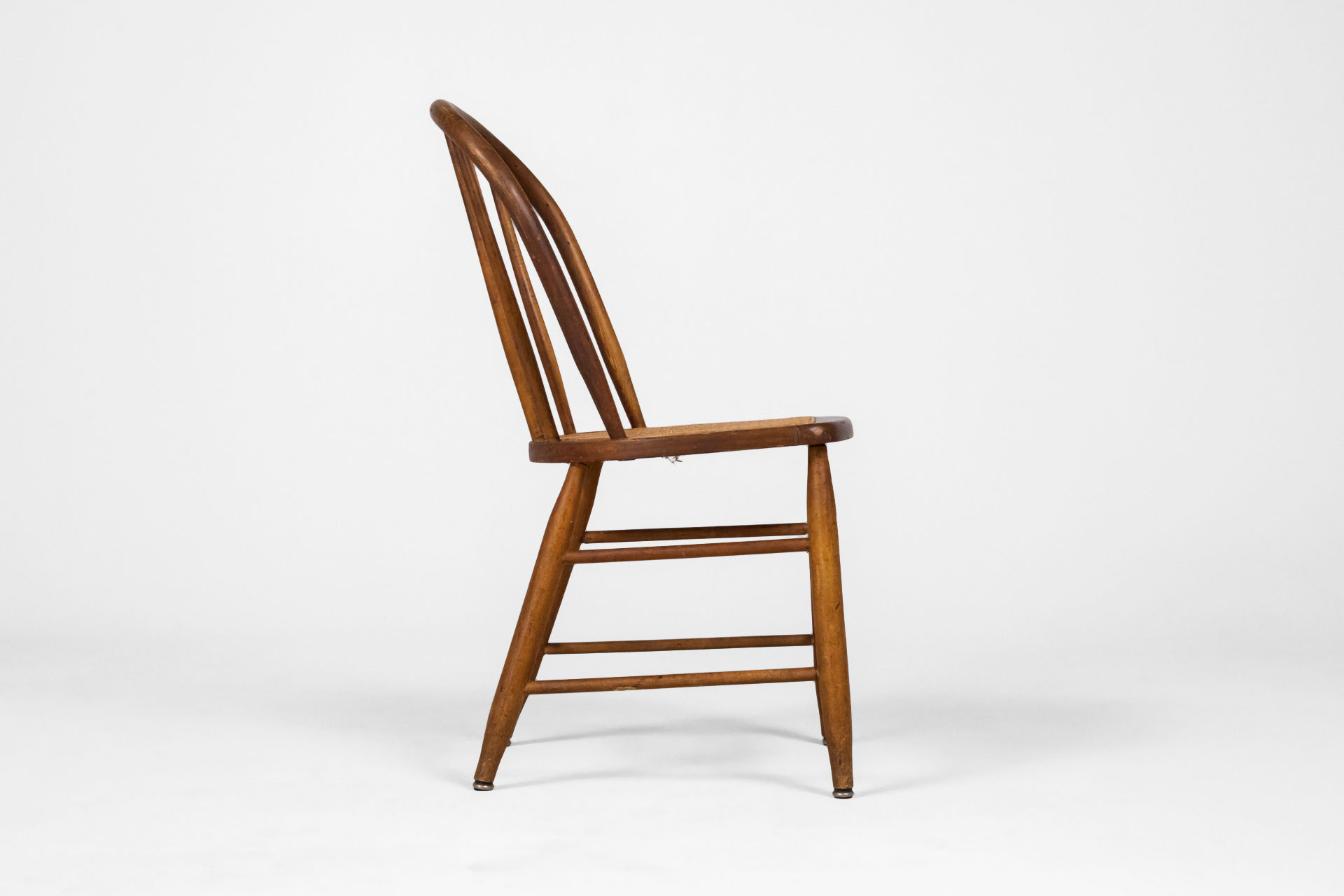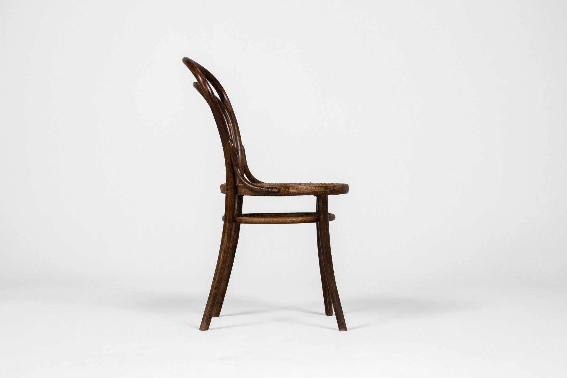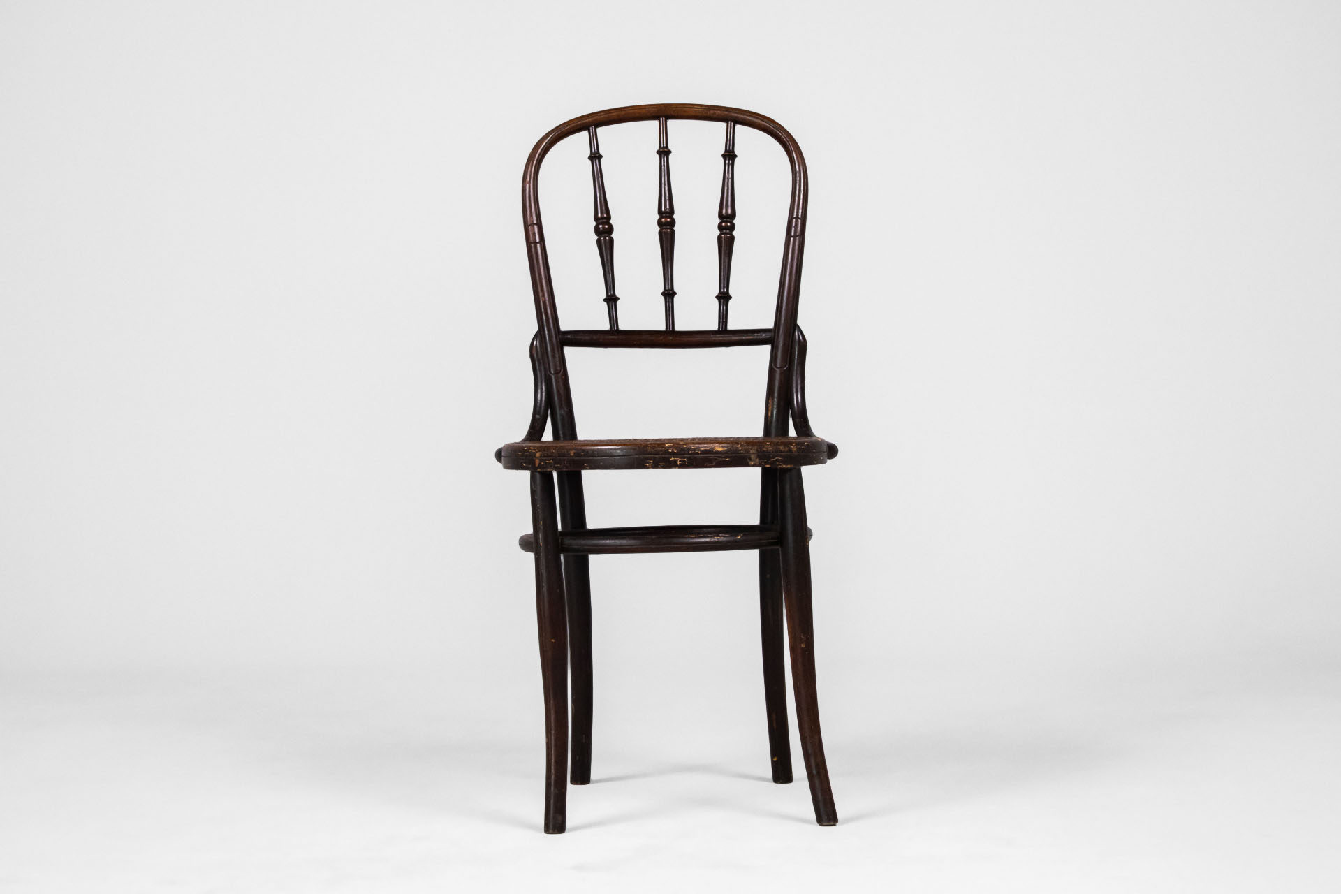 Tradicionális stílusú, vintage fa étkezőszék, amely klasszikus, ívelt háttámlával rendelkezik. A lakkozás kiemeli a famintázat természetes szépségét