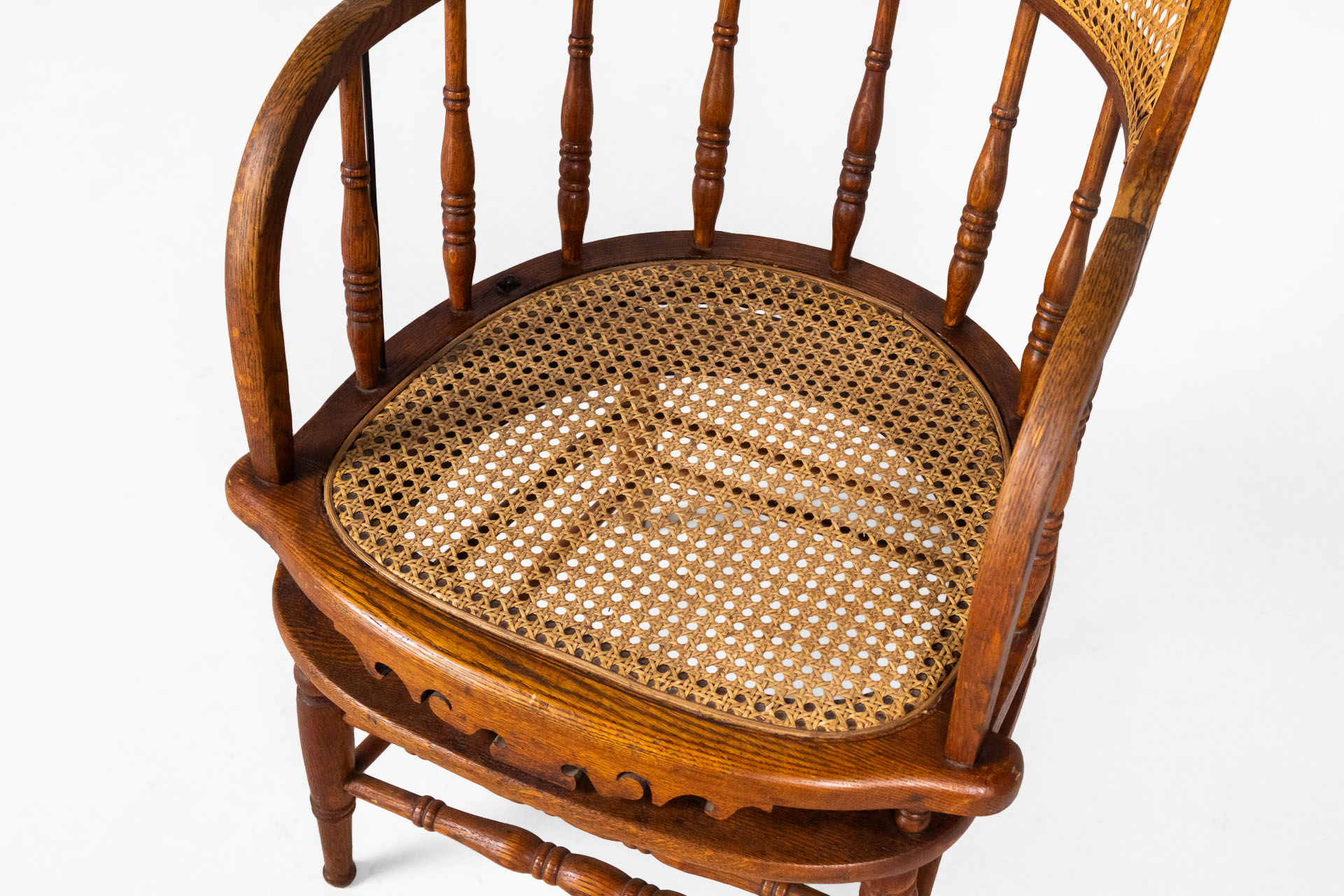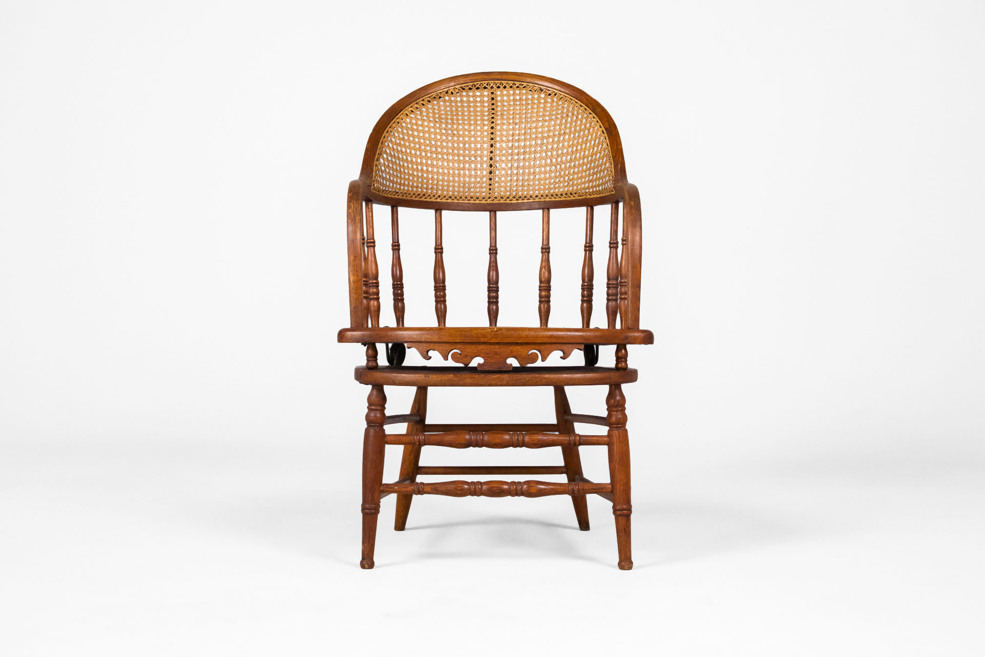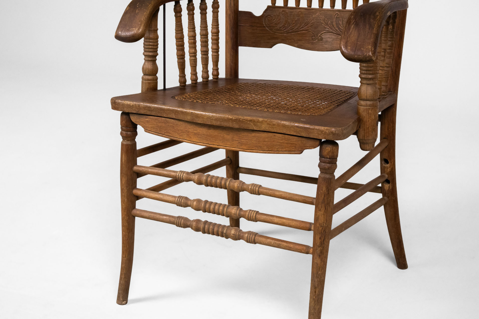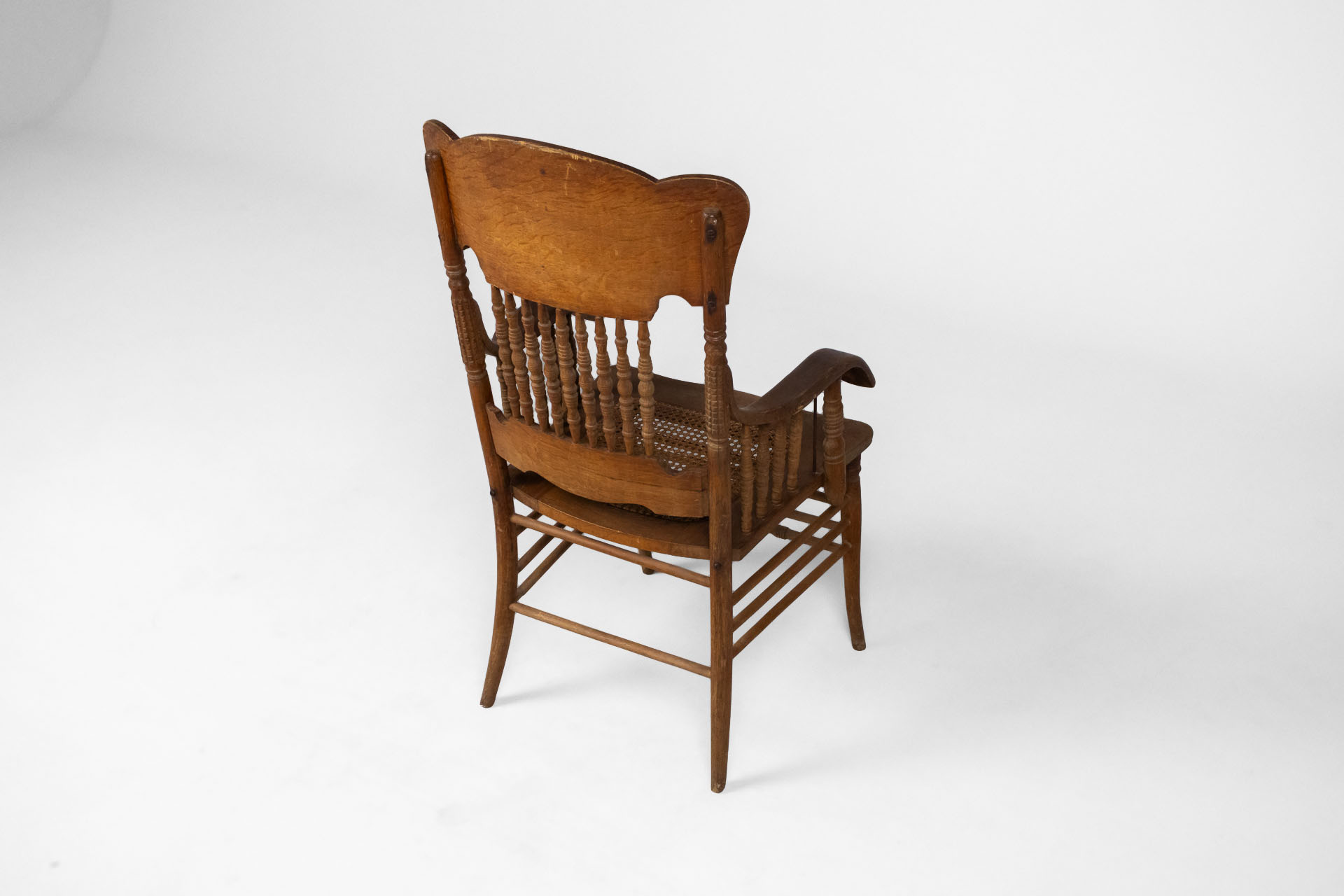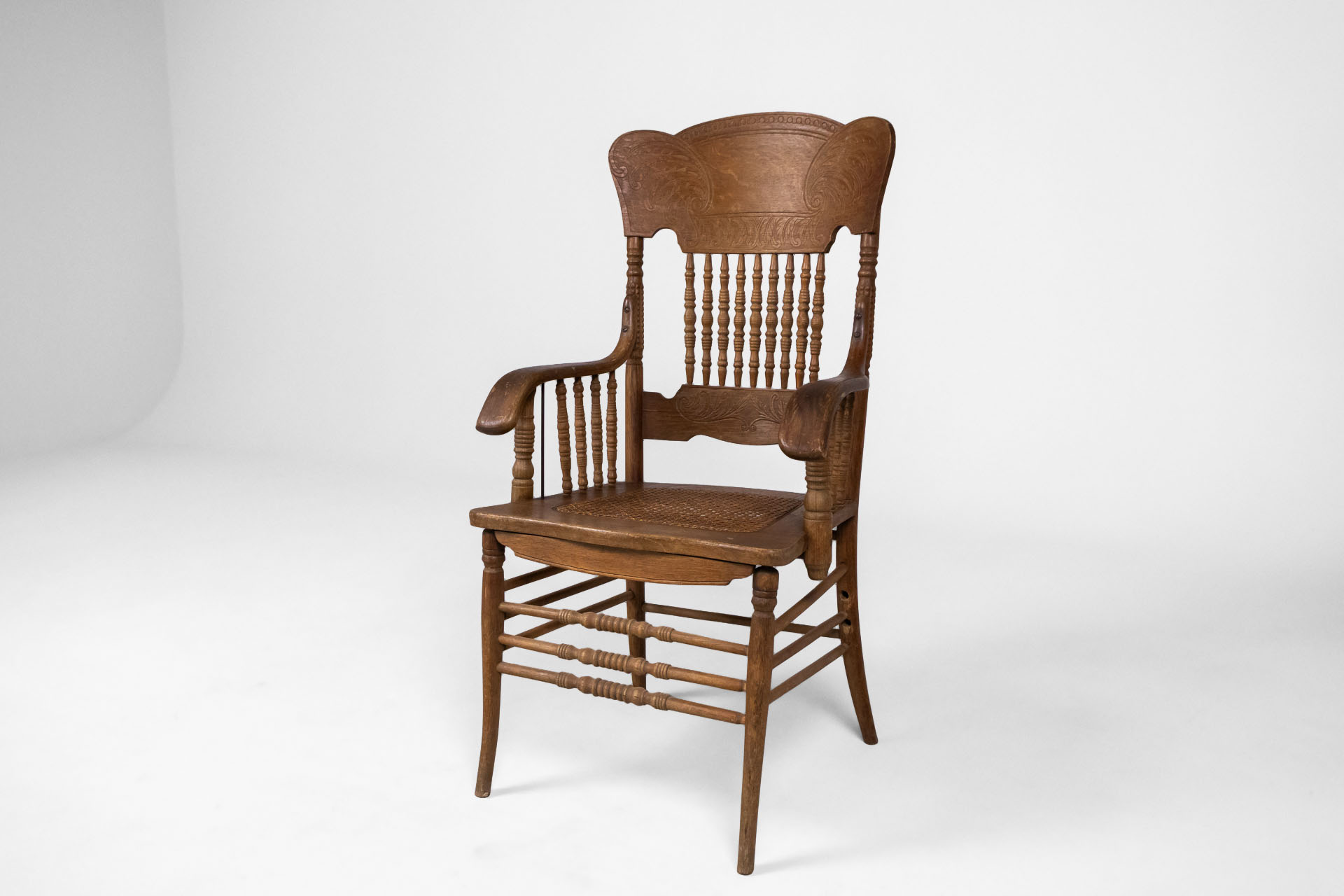 Tradicionális stílusú, fonott háttámlával és ívelt karfákkal ellátott szék, amely elegáns megjelenésével és kényelmes ülőfelületével ideális választás bármely vintage enteriőr számára. A masszív fa szerkezet és a...