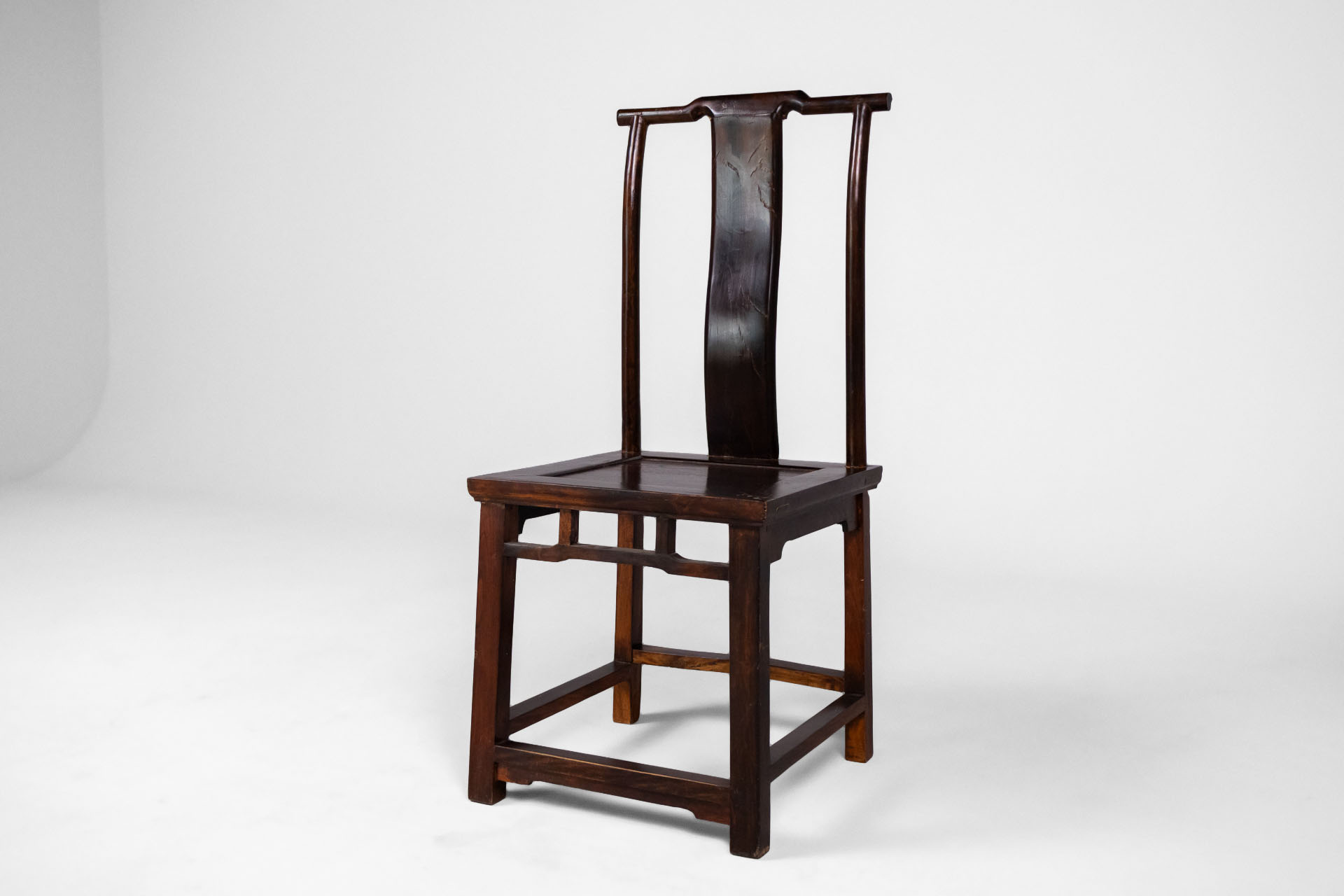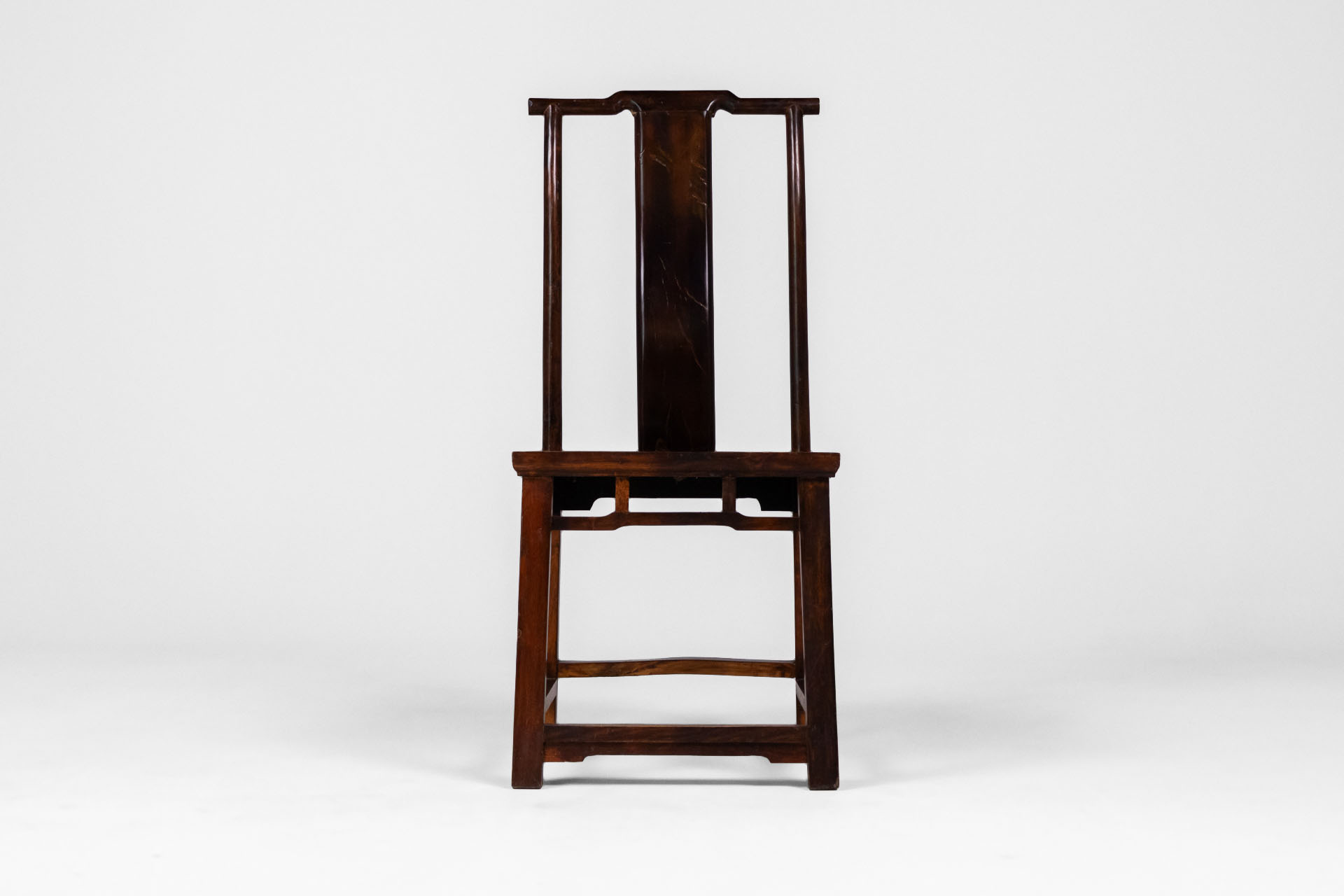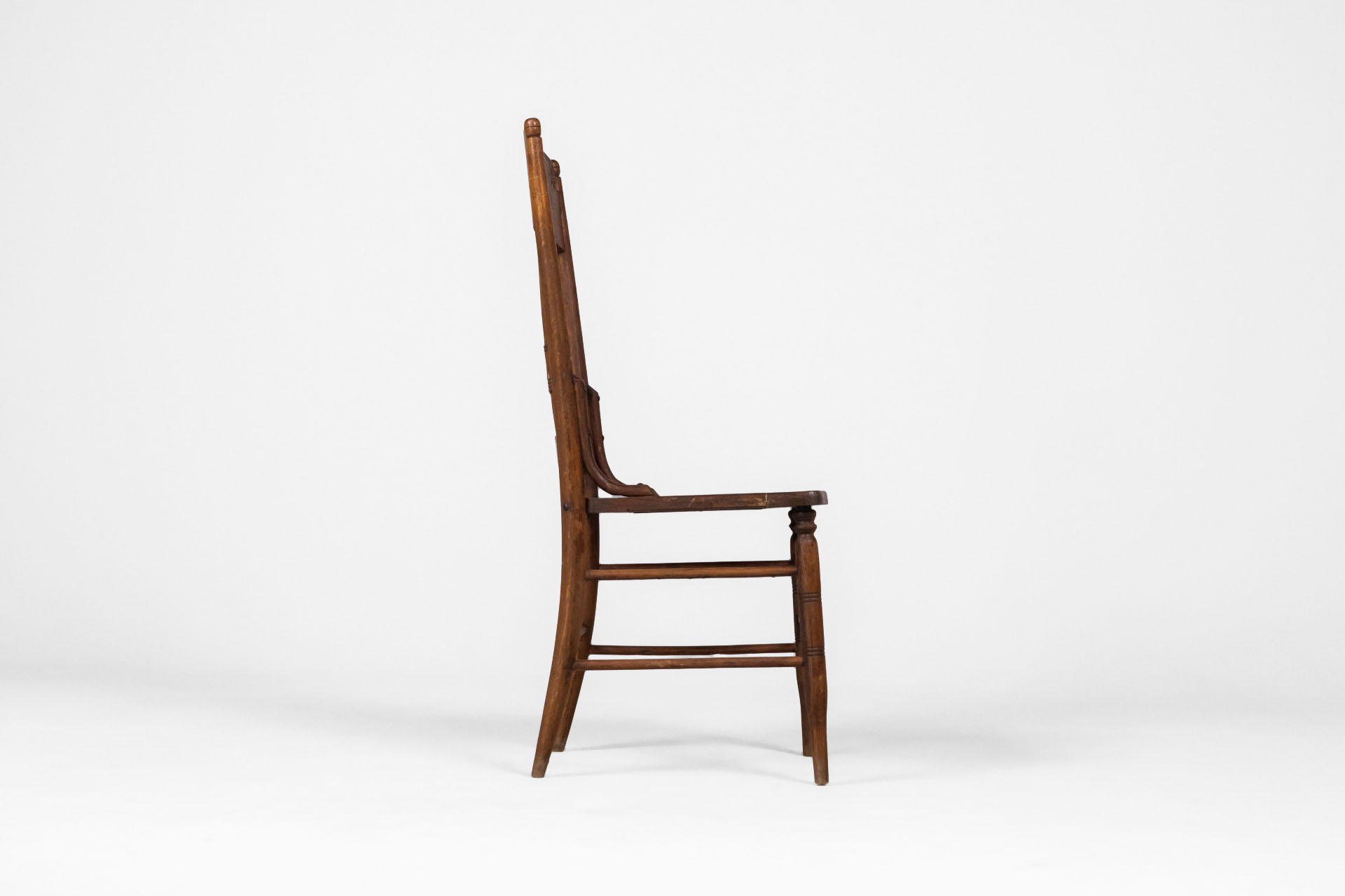 Elegáns, klasszikus stílusú fa szék, amely masszív, sötétbarna színű fából készült. A szék egyszerű, de ízléses formája és a finoman megmunkált háttámla időtlen megjelenést kölcsönöz