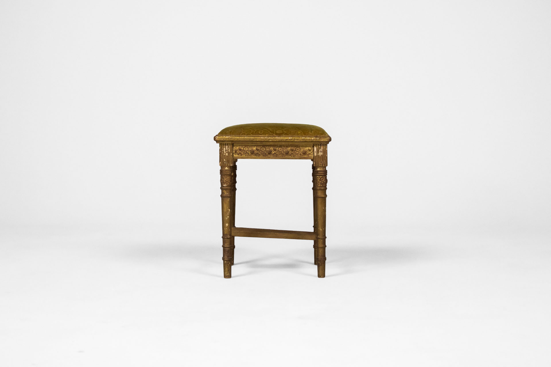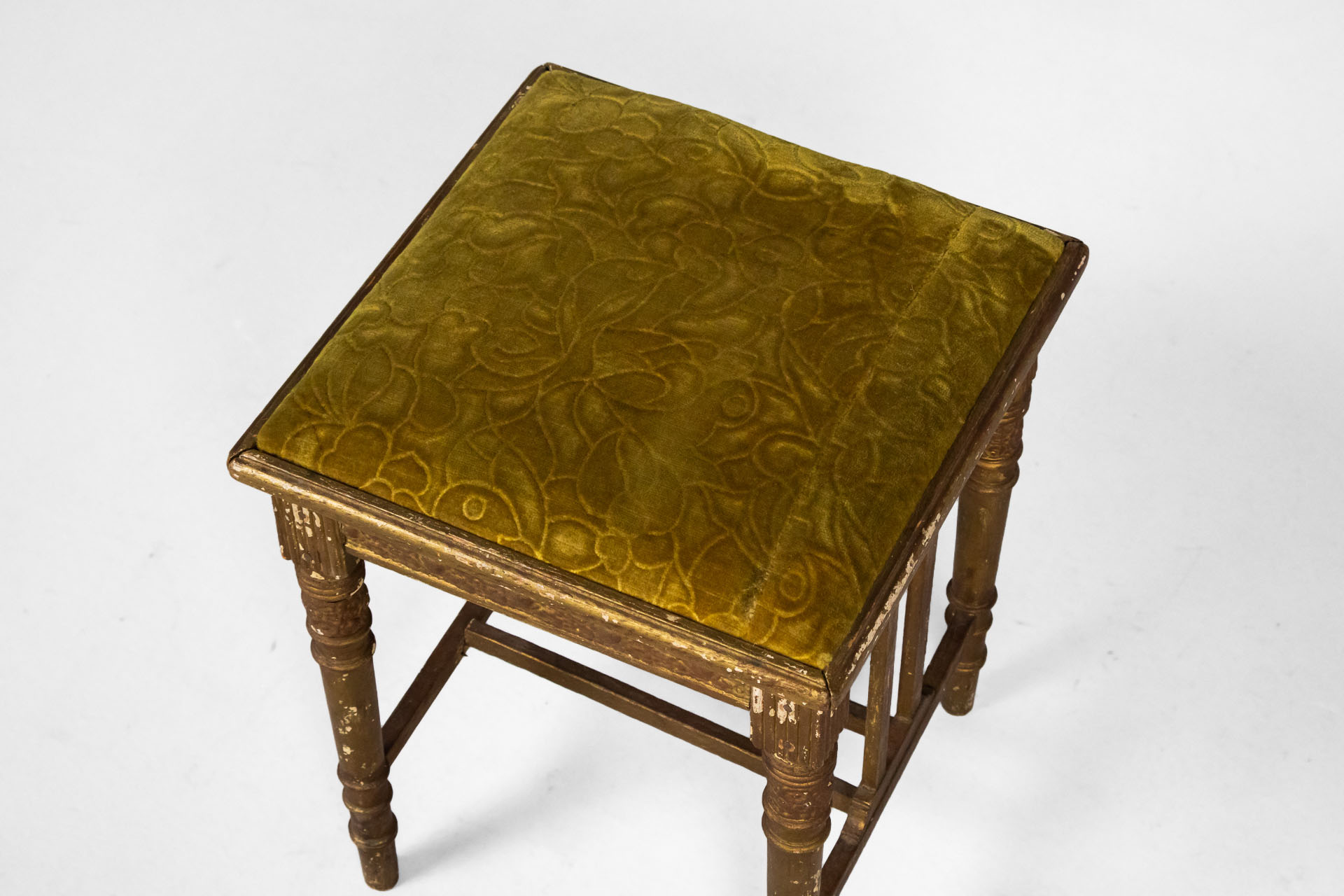 Elegáns, vintage stílusú hokedli, amely gazdagon díszített fa lábakkal és puha, zöld bársonyos ülőfelülettel rendelkezik. A klasszikus formája és a részletes faragások időtlen megjelenést kölcsönöznek, ideális...