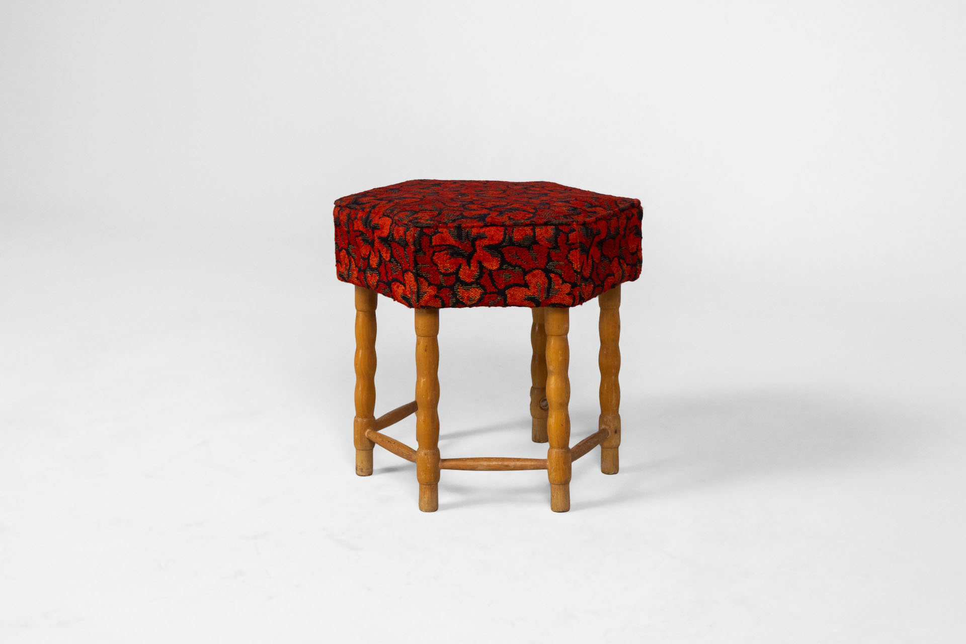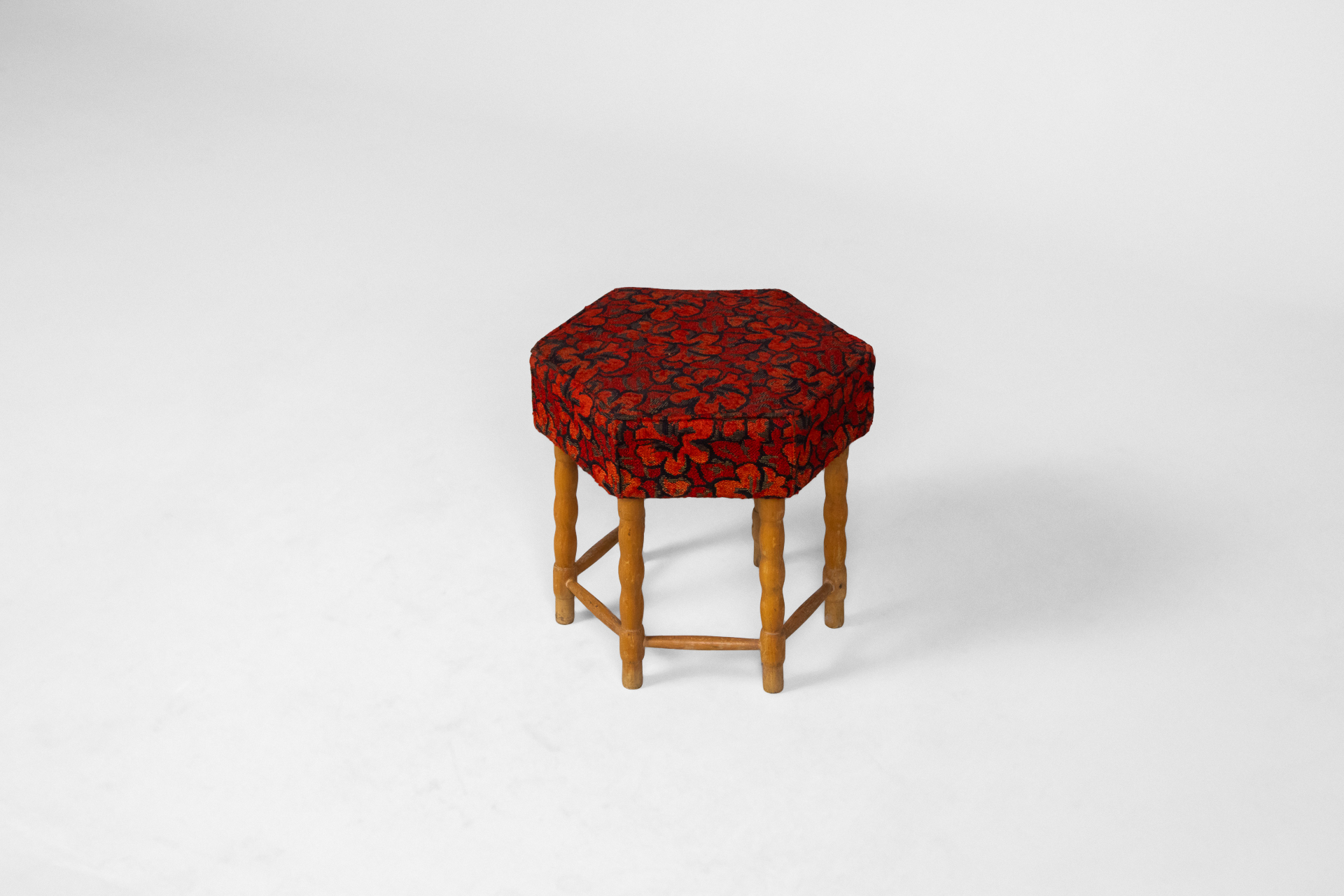 Hatszögletű piros virágmintás puff világos fa lábakkal
