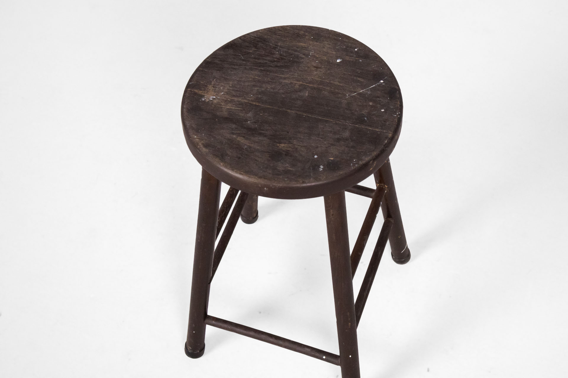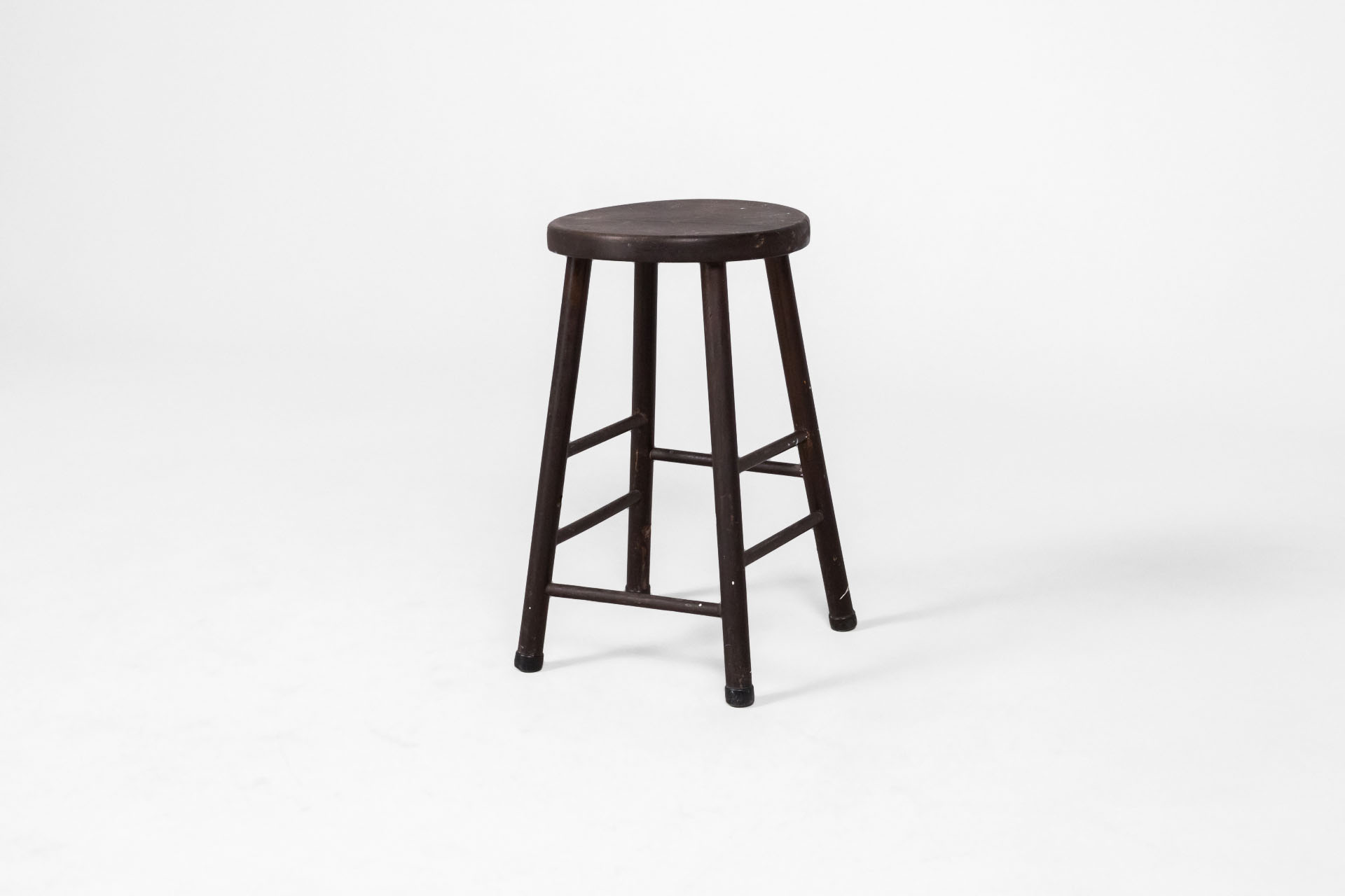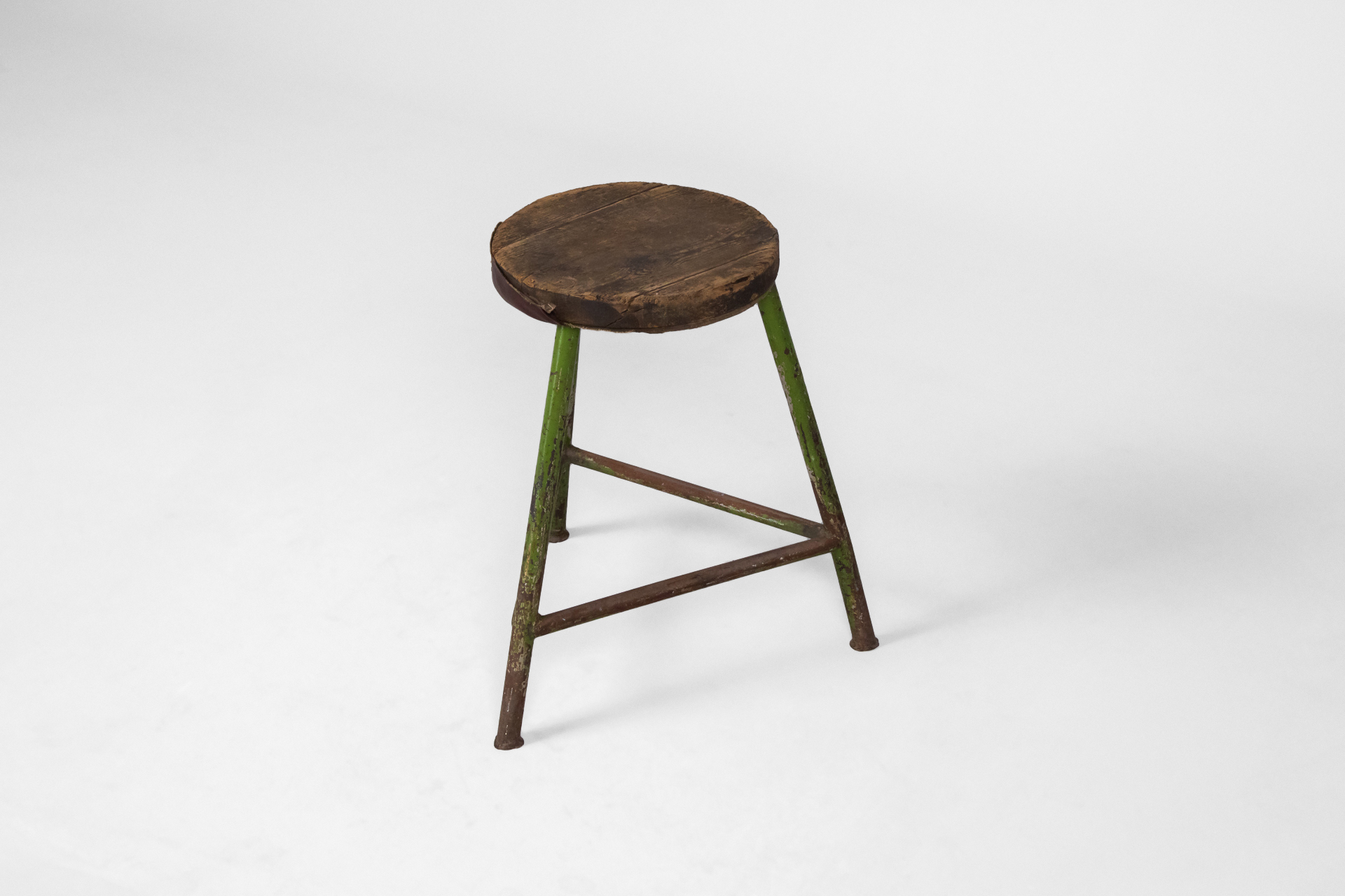 Kerek hokedli sötétbarna fa ülőfelülettel és zöld festésű fém lábakkal
